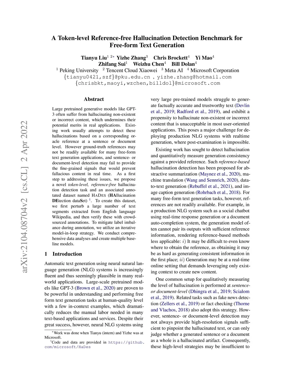 Large pretrained generative models like GPT-3 often suffer from hallucinating non-existent or incorrect content, which undermines their potential merits in real applications. Existing work usually attempts to detect these hallucinations based on a corresponding oracle reference at a sentence or document level. However ground-truth references may not be readily available for many free-form text generation applications, and sentence- or document-level detection may fail to provide the fine-grained signals that would prevent fallacious content in real time. As a first step to addressing these issues, we propose a novel token-level, reference-free hallucination detection task and an associated annotated dataset named HaDes (HAllucination DEtection dataSet). To create this dataset, we first perturb a large number of text segments extracted from English language Wikipedia, and then verify these with crowd-sourced annotations. To mitigate label imbalance during annotation, we utilize an iterative model-in-loop strategy. We conduct comprehensive data analyses and create multiple baseline models.