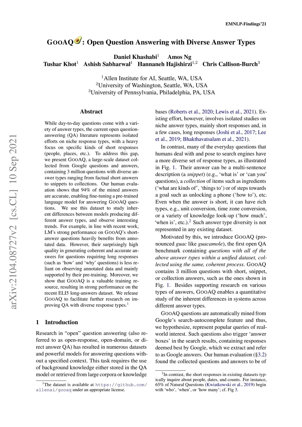 While day-to-day questions come with a variety of answer types, the current question-answering (QA) literature has failed to adequately address the answer diversity of questions. To this end, we present GooAQ, a large-scale dataset with a variety of answer types. This dataset contains over 5 million questions and 3 million answers collected from Google. GooAQ questions are collected semi-automatically from the Google search engine using its autocomplete feature. This results in naturalistic questions of practical interest that are nonetheless short and expressed using simple language. GooAQ answers are mined from Google's responses to our collected questions, specifically from the answer boxes in the search results. This yields a rich space of answer types, containing both textual answers (short and long) as well as more structured ones such as collections. We benchmarkT5 models on GooAQ and observe that: (a) in line with recent work, LM's strong performance on GooAQ's short-answer questions heavily benefit from annotated data; however, (b) their quality in generating coherent and accurate responses for questions requiring long responses (such as 'how' and 'why' questions) is less reliant on observing annotated data and mainly supported by their pre-training. We release GooAQ to facilitate further research on improving QA with diverse response types.