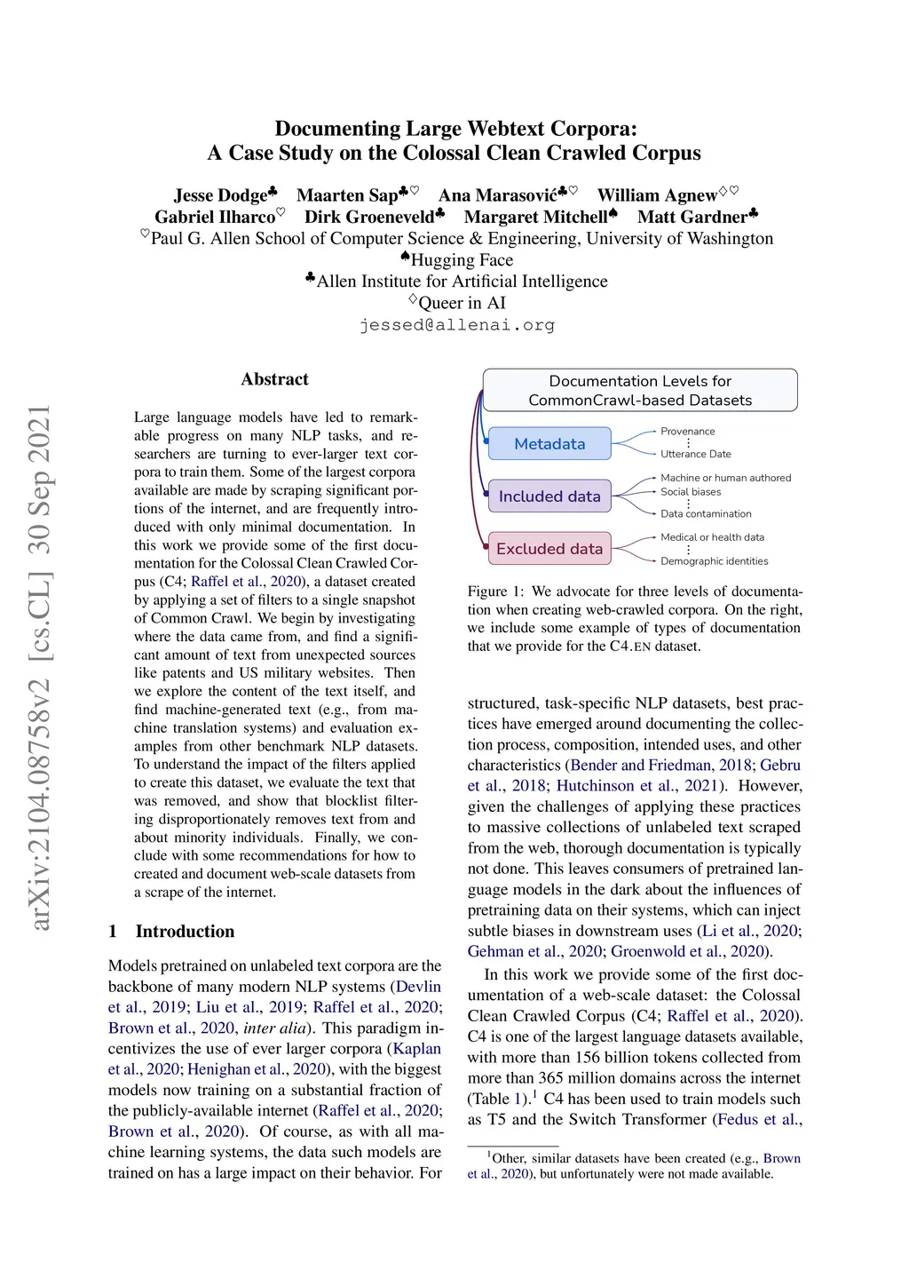 Large language models have led to remarkable progress on many NLP tasks, and researchers are turning to ever-larger text corpora to train them. Some of the largest corpora available are made by scraping significant portions of the internet, and are frequently introduced with only minimal documentation. In this work we provide some of the first documentation for the Colossal Clean Crawled Corpus (C4; Raffel et al., 2020), a dataset created by applying a set of filters to a single snapshot of Common Crawl. We begin by investigating where the data came from, and find a significant amount of text from unexpected sources like patents and US military websites. Then we explore the content of the text itself, and find machine-generated text (e.g., from machine translation systems) and evaluation examples from other benchmark NLP datasets. To understand the impact of the filters applied to create this dataset, we evaluate the text that was removed, and show that blocklist filtering disproportionately removes text from and about minority individuals. Finally, we conclude with some recommendations for how to created and document web-scale datasets from a scrape of the internet.