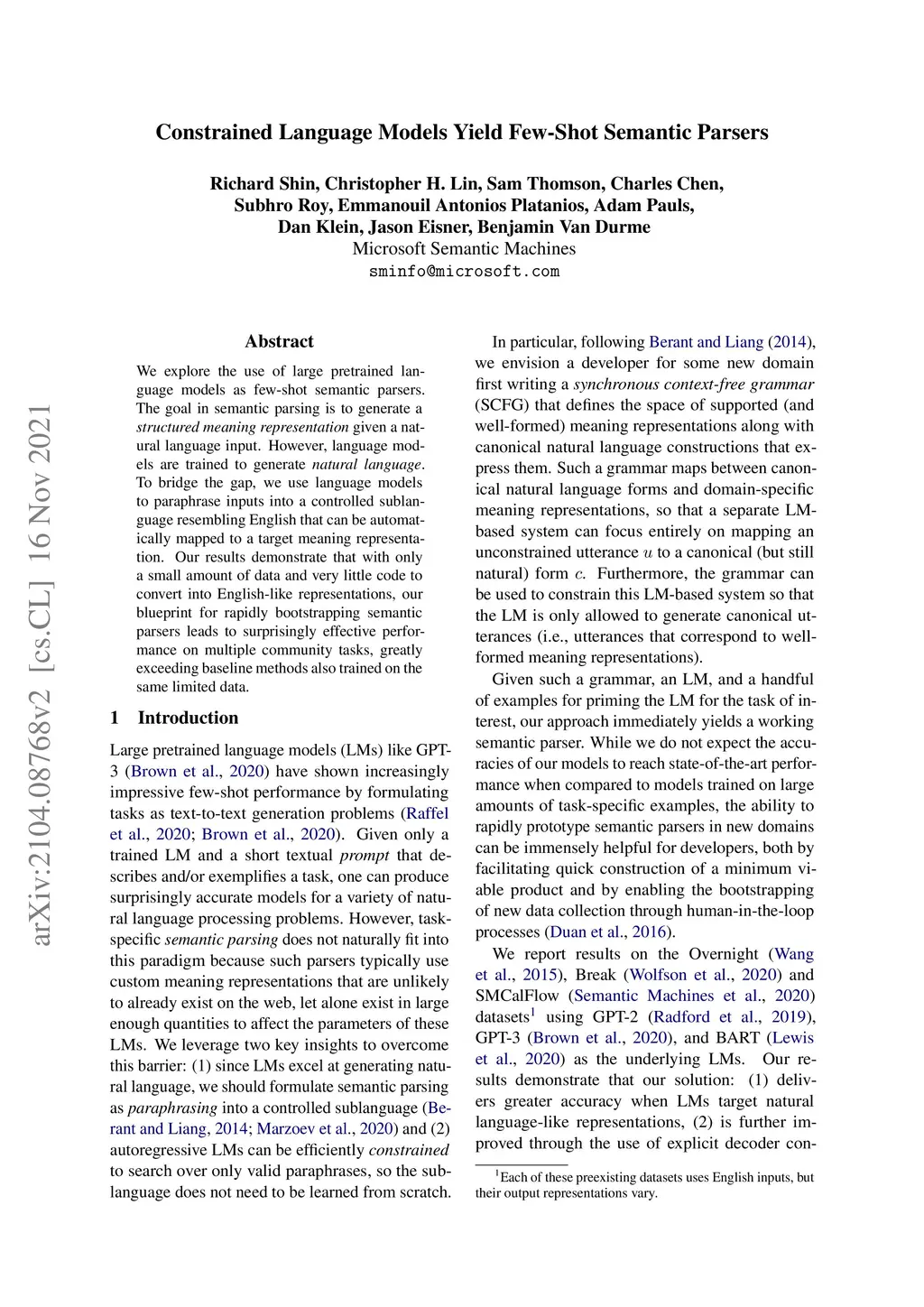 We explore the use of large pretrained language models as few-shot semantic parsers. The goal in semantic parsing is to generate a structured meaning representation given a natural language input. However, language models are trained to generate natural language. To bridge the gap, we use language models to paraphrase inputs into a controlled sublanguage resembling English that can be automatically mapped to a target meaning representation. Our results demonstrate that with only a small amount of data and very little code to convert into English-like representations, our blueprint for rapidly bootstrapping semantic parsers leads to surprisingly effective performance on multiple community tasks, greatly exceeding baseline methods also trained on the same limited data.