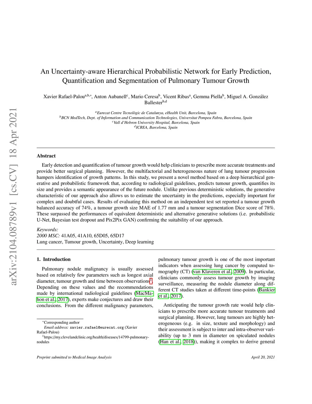 Prediction, Quantification and Segmentation of Pulmonary Tumour Growth
