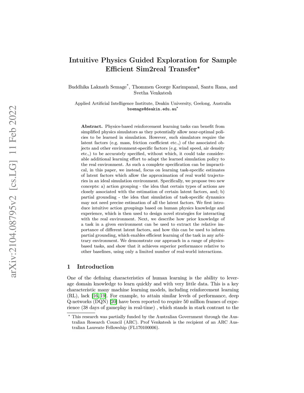 Physics-based reinforcement learning tasks can benefit from simplified physics simulators as they potentially allow near-optimal policies to be learned in simulation. However, such simulators require the latent factors (e.g. mass, friction coefficient etc.) of the associated objects and other environment-specific factors (e.g. wind speed, air density etc.) to be accurately specified, without which, it could take considerable additional learning effort to adapt the learned simulation policy to the real environment. As such a complete specification can be impractical, in this paper, we instead, focus on learning task-specific estimates of latent factors which allow the approximation of real world trajectories in an ideal simulation environment. Specifically, we propose two new concepts: a) action grouping - the idea that certain types of actions are closely associated with the estimation of certain latent factors, and; b) partial grounding - the idea that simulation of task-specific dynamics may not need precise estimation of all the latent factors. We first introduce intuitive action groupings based on human physics knowledge and experience, which is then used to design novel strategies for interacting with the real environment. Next, we describe how prior knowledge of a task in a given environment can be used to extract the relative importance of different latent factors, and how this can be used to inform partial grounding, which enables efficient learning of the task in any arbitrary environment. We demonstrate our approach in a range of physics based tasks, and show that it achieves superior performance relative to other baselines, using only a limited number of real-world interactions.