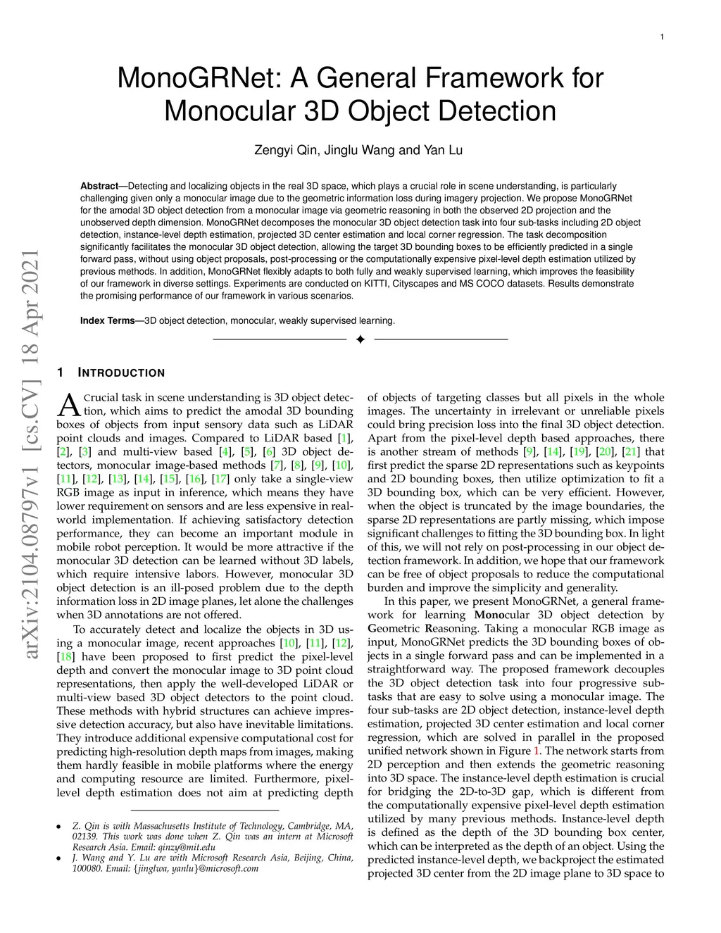 MonoGRNet: A General Framework for Monocular 3D Object Detection
