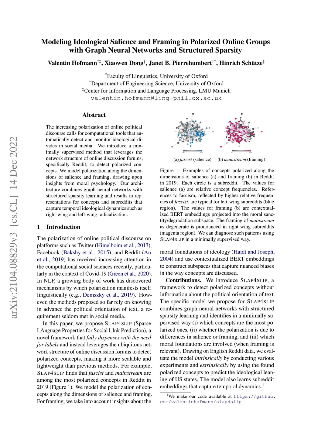 The increasing polarization of online political discourse calls for computational tools that automatically detect and monitor ideological divides in social media. We introduce a minimally supervised method that leverages the network structure of online discussion forums, specifically Reddit, to detect polarized concepts. We model polarization along the dimensions of salience and framing, drawing upon insights from moral psychology. Our architecture combines graph neural networks with structured sparsity learning and results in representations for concepts and subreddits that capture temporal ideological dynamics such as right-wing and left-wing radicalization.