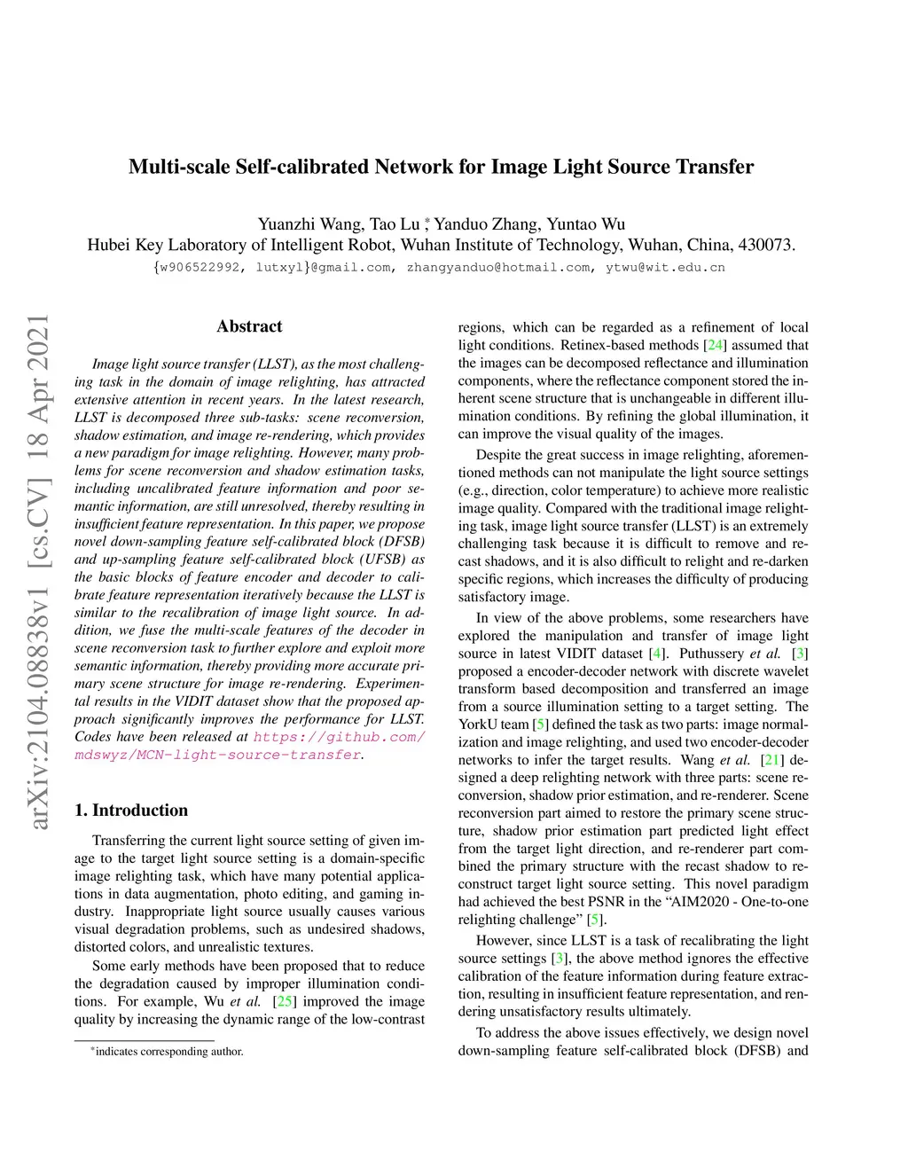 Multi-scale Self-calibrated Network for Image Light Source Transfer
