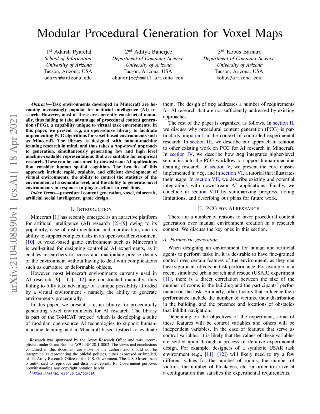 Task environments developed in Minecraft are becoming increasingly popular for artificial intelligence (AI) research. However, most of these are currently constructed manually, thus failing to take advantage of procedural content generation (PCG), a capability unique to virtual task environments. In this paper, we present mcg, an open-source library to facilitate implementing PCG algorithms for voxel-based environments such as Minecraft. The library is designed with human-machine teaming research in mind, and thus takes a 'top-down' approach to generation, simultaneously generating low and high level machine-readable representations that are suitable for empirical research. These can be consumed by downstream AI applications that consider human spatial cognition. The benefits of this approach include rapid, scalable, and efficient development of virtual environments, the ability to control the statistics of the environment at a semantic level, and the ability to generate novel environments in response to player actions in real time.