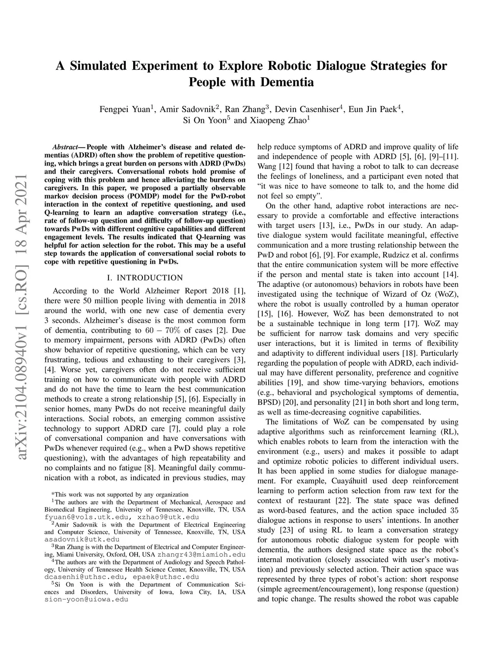 People with Alzheimer's disease and related dementias (ADRD) often show the problem of repetitive questioning, which brings a great burden on persons with ADRD (PwDs) and their caregivers. Conversational robots hold promise of coping with this problem and hence alleviating the burdens on caregivers. In this paper, we proposed a partially observable markov decision process (POMDP) model for the PwD-robot interaction in the context of repetitive questioning, and used Q-learning to learn an adaptive conversation strategy (i.e., rate of follow-up question and difficulty of follow-up question) towards PwDs with different cognitive capabilities and different engagement levels. The results indicated that Q-learning was helpful for action selection for the robot. This may be a useful step towards the application of conversational social robots to cope with repetitive questioning in PwDs.