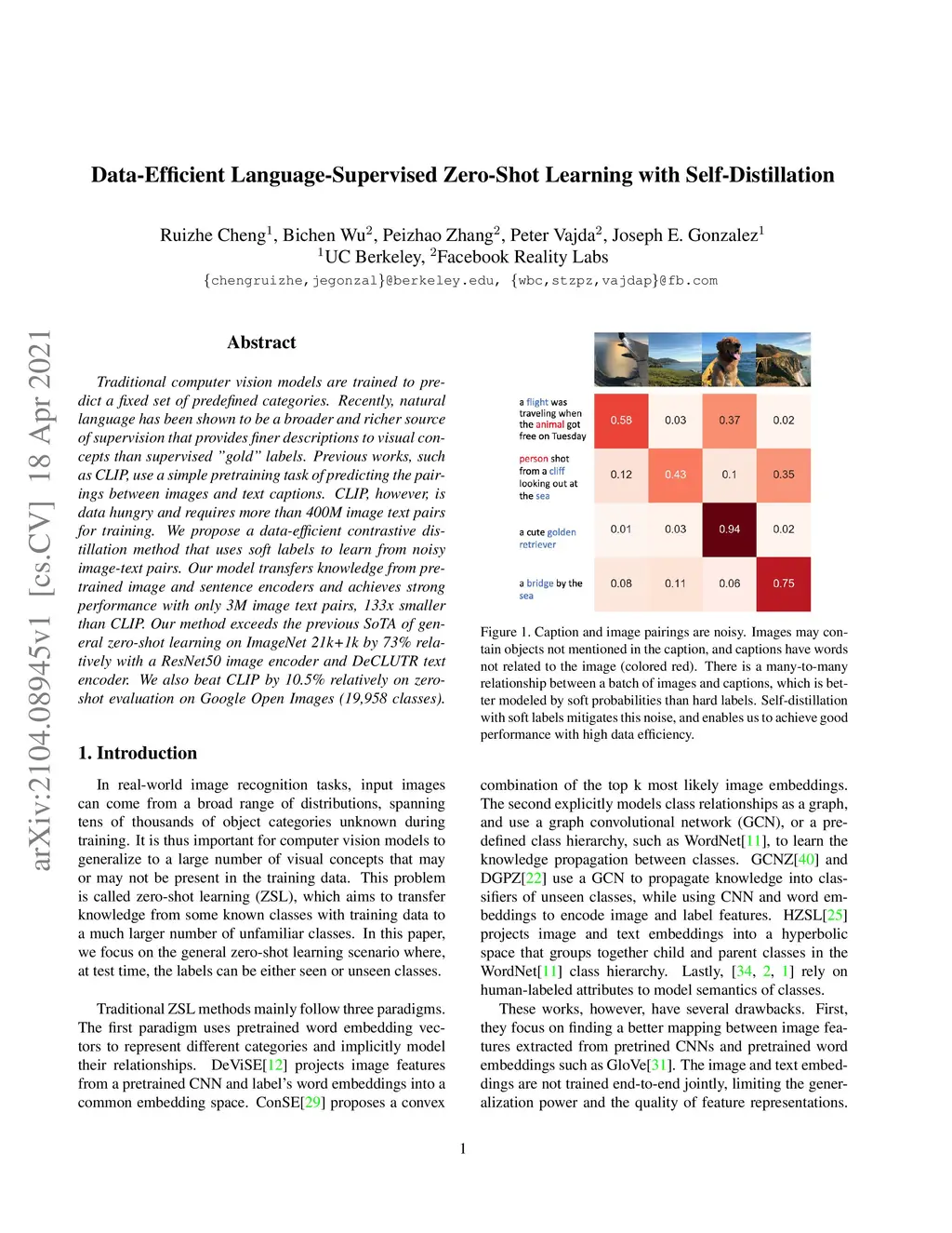 Traditional computer vision models are trained to predict a fixed set of predefined categories. Recently, natural language has been shown to be a broader and richer source of supervision that provides finer descriptions to visual concepts than supervised "gold" labels. Previous works, such as CLIP, use a simple pretraining task of predicting the pairings between images and text captions. CLIP, however, is data hungry and requires more than 400M image text pairs for training. We propose a data-efficient contrastive distillation method that uses soft labels to learn from noisy image-text pairs. Our model transfers knowledge from pretrained image and sentence encoders and achieves strong performance with only 3M image text pairs, 133x smaller than CLIP. Our method exceeds the previous SoTA of general zero-shot learning on ImageNet 21k+1k by 73% relatively with a ResNet50 image encoder and DeCLUTR text encoder. We also beat CLIP by 10.5% relatively on zero-shot evaluation on Google Open Images (19,958 classes).
