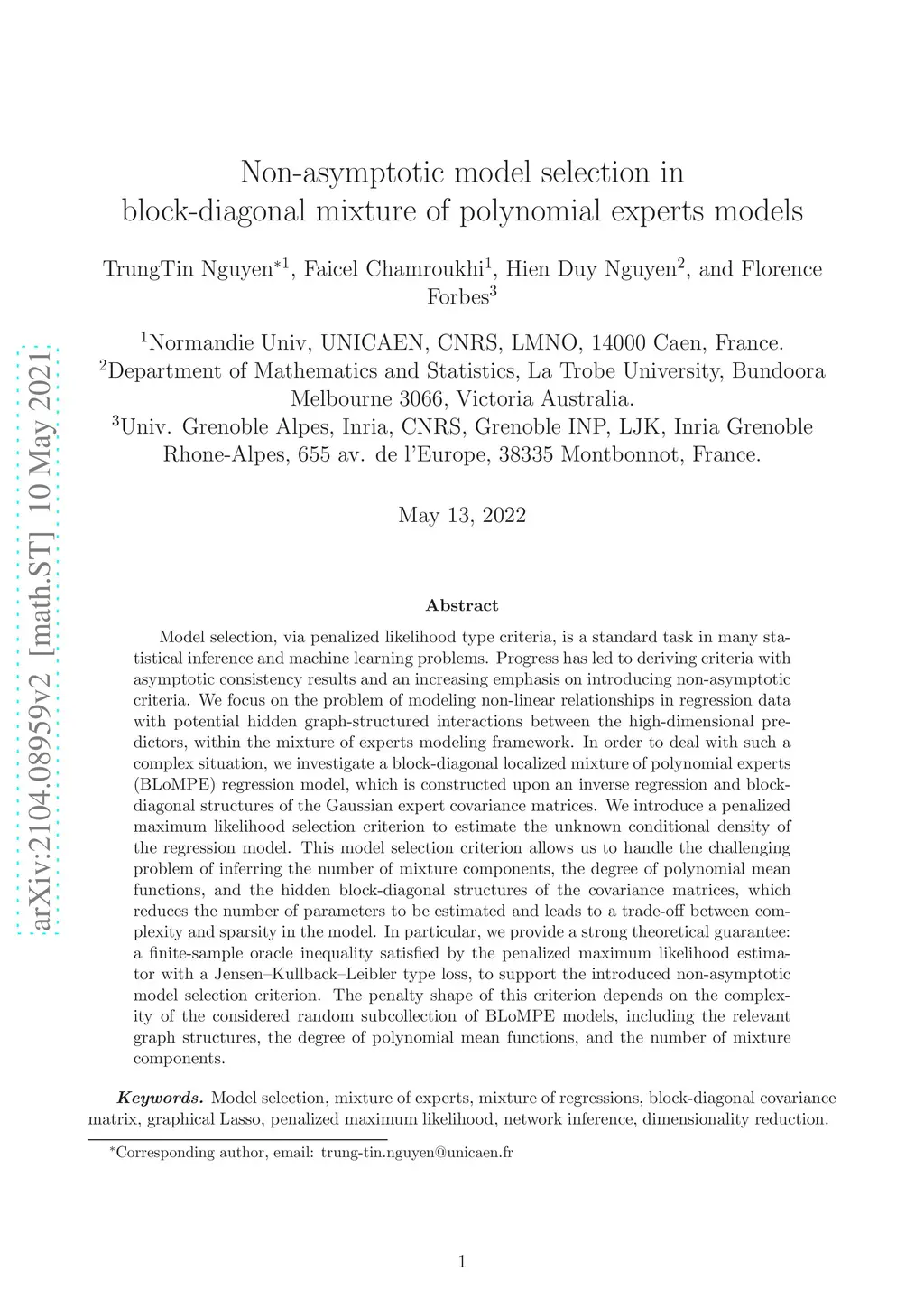 Model selection, via penalized likelihood type criteria, is a standard task in many statistical inference and machine learning problems. Progress has led to deriving criteria with asymptotic consistency results and an increasing emphasis on introducing non-asymptotic criteria. We focus on the problem of modeling non-linear relationships in regression data with potential hidden graph-structured interactions between the high-dimensional predictors, within the mixture of experts modeling framework. In order to deal with such a complex situation, we investigate a block-diagonal localized mixture of polynomial experts (BLoMPE) regression model, which is constructed upon an inverse regression and block-diagonal structures of the Gaussian expert covariance matrices. We introduce a penalized maximum likelihood selection criterion to estimate the unknown conditional density of the regression model. This model selection criterion allows us to handle the challenging problem of inferring the number of mixture components, the degree of polynomial mean functions, and the hidden block-diagonal structures of the covariance matrices, which reduces the number of parameters to be estimated and leads to a trade-off between complexity and sparsity in the model. In particular, we provide a strong theoretical guarantee: a finite-sample oracle inequality satisfied by the penalized maximum likelihood estimator with a Jensen-Kullback-Leibler type loss, to support the introduced non-asymptotic model selection criterion. The penalty shape of this criterion depends on the complexity of the considered random subcollection of BLoMPE models, including the relevant graph structures, the degree of polynomial mean functions, and the number of mixture components.