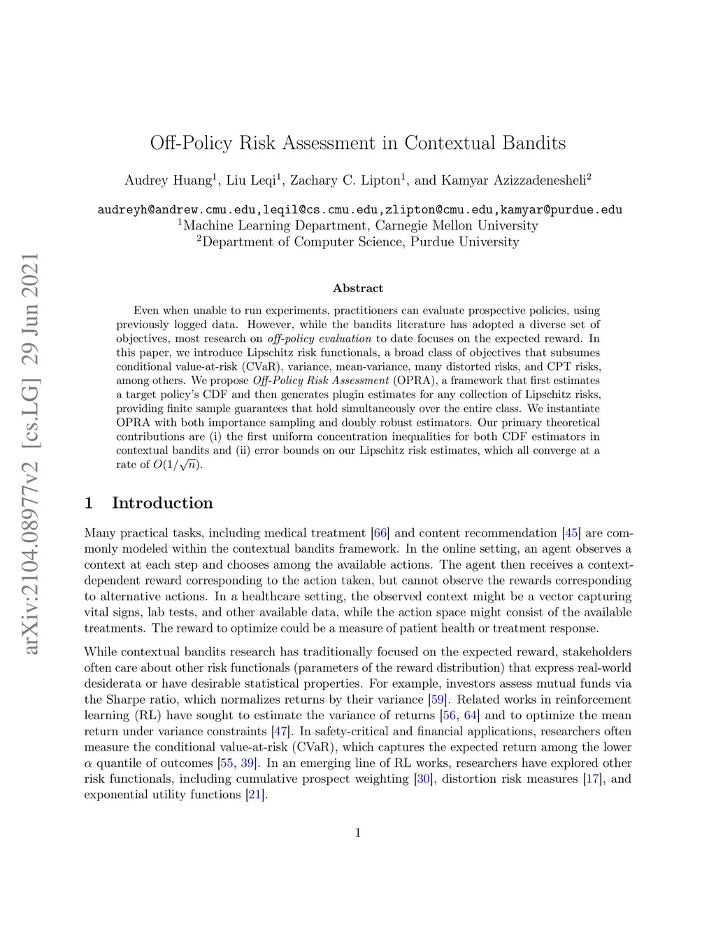 Even when unable to run experiments, practitioners can evaluate prospective policies, using previously logged data. However, while the bandits literature has adopted a diverse set of objectives, most research on off-policy evaluation to date focuses on the expected reward. In this paper, we introduce Lipschitz risk functionals, a broad class of objectives that subsumes conditional value-at-risk (CVaR), variance, mean-variance, many distorted risks, and CPT risks, among others. We propose Off-Policy Risk Assessment (OPRA), a framework that first estimates a target policy's CDF and then generates plugin estimates for any collection of Lipschitz risks, providing finite sample guarantees that hold simultaneously over the entire class. We instantiate OPRA with both importance sampling and doubly robust estimators. Our primary theoretical contributions are (i) the first uniform concentration inequalities for both CDF estimators in contextual bandits and (ii) error bounds on our Lipschitz risk estimates, which all converge at a rate of .