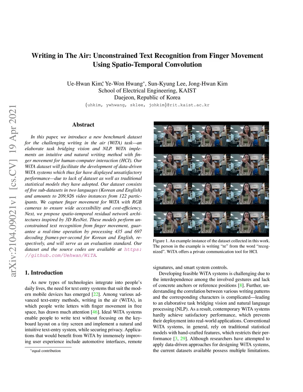 In this paper, we introduce a new benchmark dataset for the challenging writing in the air (WiTA) task -- an elaborate task bridging vision and NLP. WiTA implements an intuitive and natural writing method with finger movement for human-computer interaction (HCI). Our WiTA dataset will facilitate the development of data-driven WiTA systems which thus far have displayed unsatisfactory performance -- due to lack of dataset as well as traditional statistical models they have adopted. Our dataset consists of five sub-datasets in two languages (Korean and English) and amounts to 209,926 video instances from 122 participants. We capture finger movement for WiTA with RGB cameras to ensure wide accessibility and cost-efficiency. Next, we propose spatio-temporal residual network architectures inspired by 3D ResNet. These models perform unconstrained text recognition from finger movement, guarantee a real-time operation by processing 435 and 697 decoding frames-per-second for Korean and English, respectively, and will serve as an evaluation standard. Our dataset and the source codes are available at https://github.com/Uehwan/WiTA.