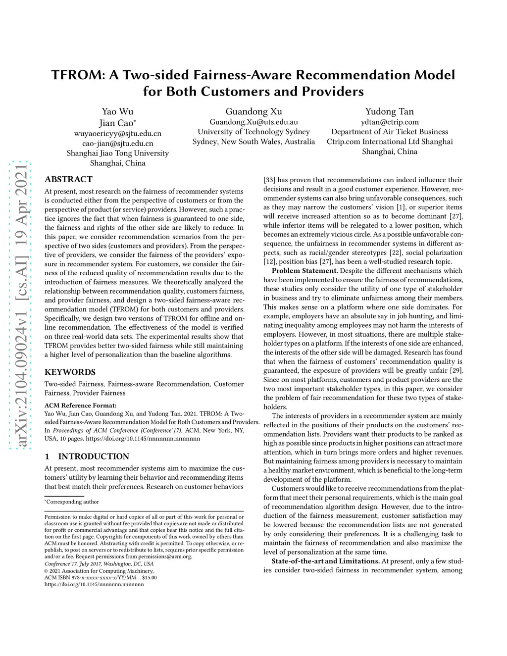 TFROM: A Two-sided Fairness-Aware Recommendation Model for Both