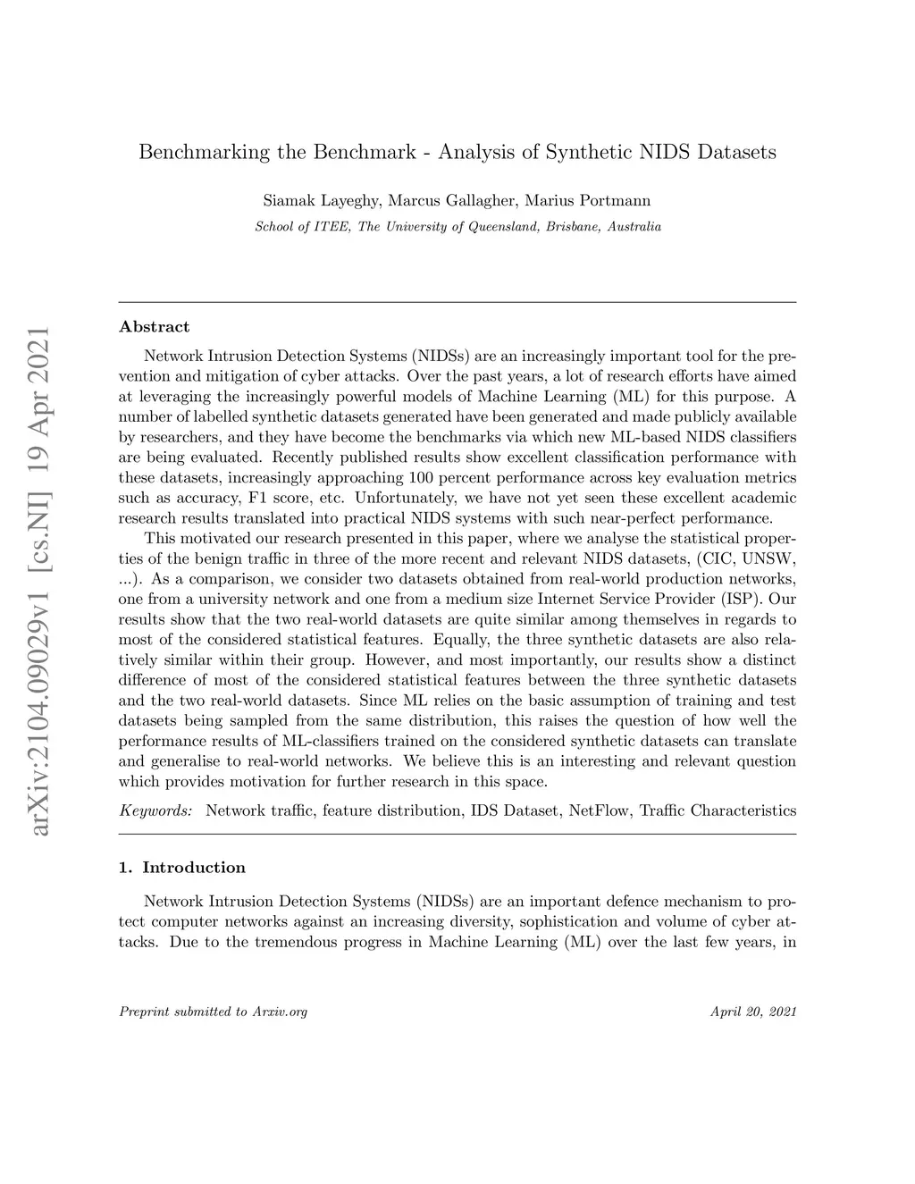 Network Intrusion Detection Systems (NIDSs) are an increasingly important tool for the prevention and mitigation of cyber attacks. A number of labelled synthetic datasets generated have been generated and made publicly available by researchers, and they have become the benchmarks via which new ML-based NIDS classifiers are being evaluated. Recently published results show excellent classification performance with these datasets, increasingly approaching 100 percent performance across key evaluation metrics such as accuracy, F1 score, etc. Unfortunately, we have not yet seen these excellent academic research results translated into practical NIDS systems with such near-perfect performance. This motivated our research presented in this paper, where we analyse the statistical properties of the benign traffic in three of the more recent and relevant NIDS datasets, (CIC, UNSW, ...). As a comparison, we consider two datasets obtained from real-world production networks, one from a university network and one from a medium size Internet Service Provider (ISP). Our results show that the two real-world datasets are quite similar among themselves in regards to most of the considered statistical features. Equally, the three synthetic datasets are also relatively similar within their group. However, and most importantly, our results show a distinct difference of most of the considered statistical features between the three synthetic datasets and the two real-world datasets. Since ML relies on the basic assumption of training and test datasets being sampled from the same distribution, this raises the question of how well the performance results of ML-classifiers trained on the considered synthetic datasets can translate and generalise to real-world networks. We believe this is an interesting and relevant question which provides motivation for further research in this space.