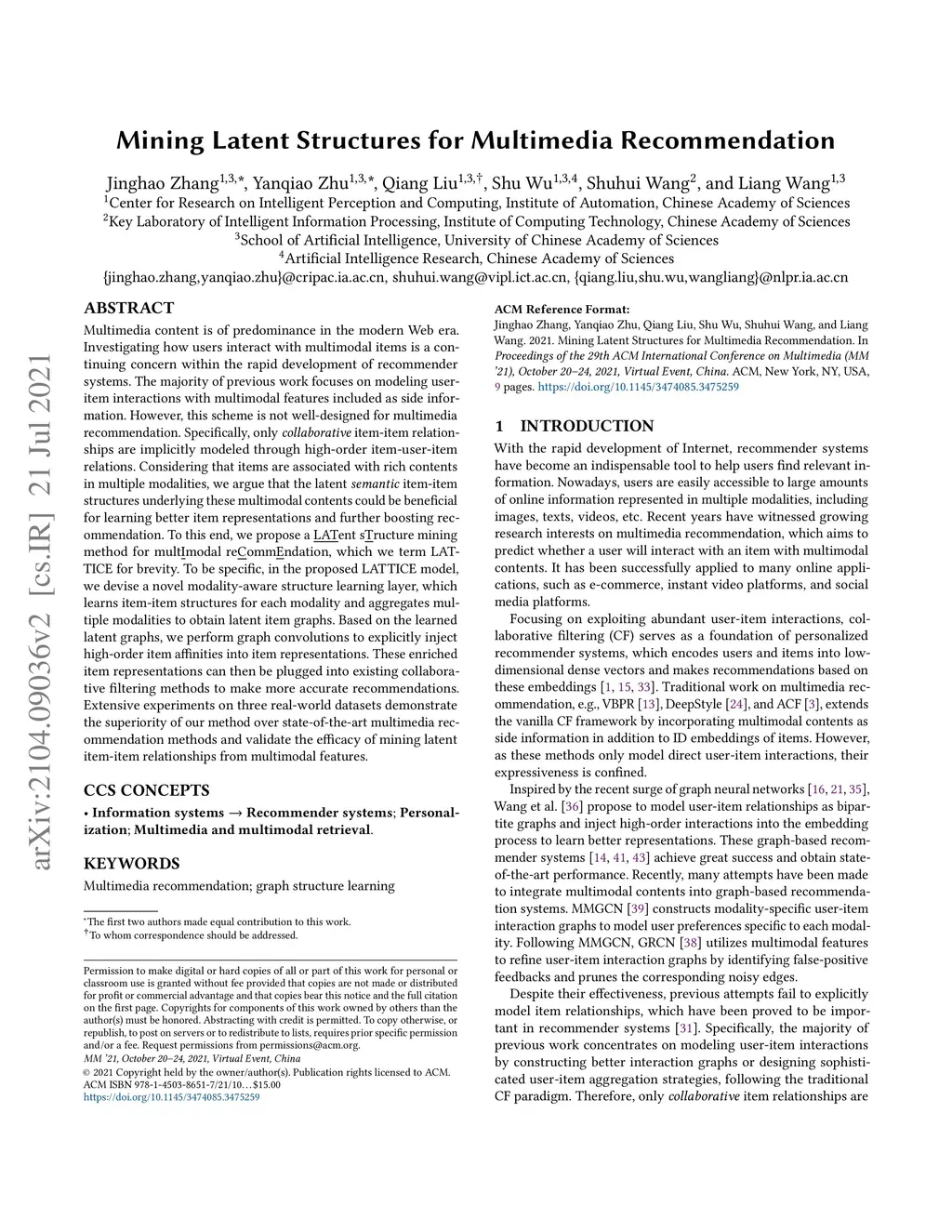 Multimedia content is of predominance in the modern Web era. Investigating how users interact with multimodal items is a continuing concern within the rapid development of recommender systems. The majority of previous work focuses on modeling user-item interactions with multimodal features included as side information. However, this scheme is not well-designed for multimedia recommendation. Specifically, only collaborative item-item relationships are implicitly modeled through high-order item-user-item relations. Considering that items are associated with rich contents in multiple modalities, we argue that the latent semantic item-item structures underlying these multimodal contents could be beneficial for learning better item representations and further boosting recommendation. To this end, we propose a LATent sTructure mining method for multImodal reCommEndation, which we term LATTICE for brevity. To be specific, in the proposed LATTICE model, we devise a novel modality-aware structure learning layer, which learns item-item structures for each modality and aggregates multiple modalities to obtain latent item graphs. Based on the learned latent graphs, we perform graph convolutions to explicitly inject high-order item affinities into item representations. These enriched item representations can then be plugged into existing collaborative filtering methods to make more accurate recommendations. Extensive experiments on three real-world datasets demonstrate the superiority of our method over state-of-the-art multimedia recommendation methods and validate the efficacy of mining latent item-item relationships from multimodal features.