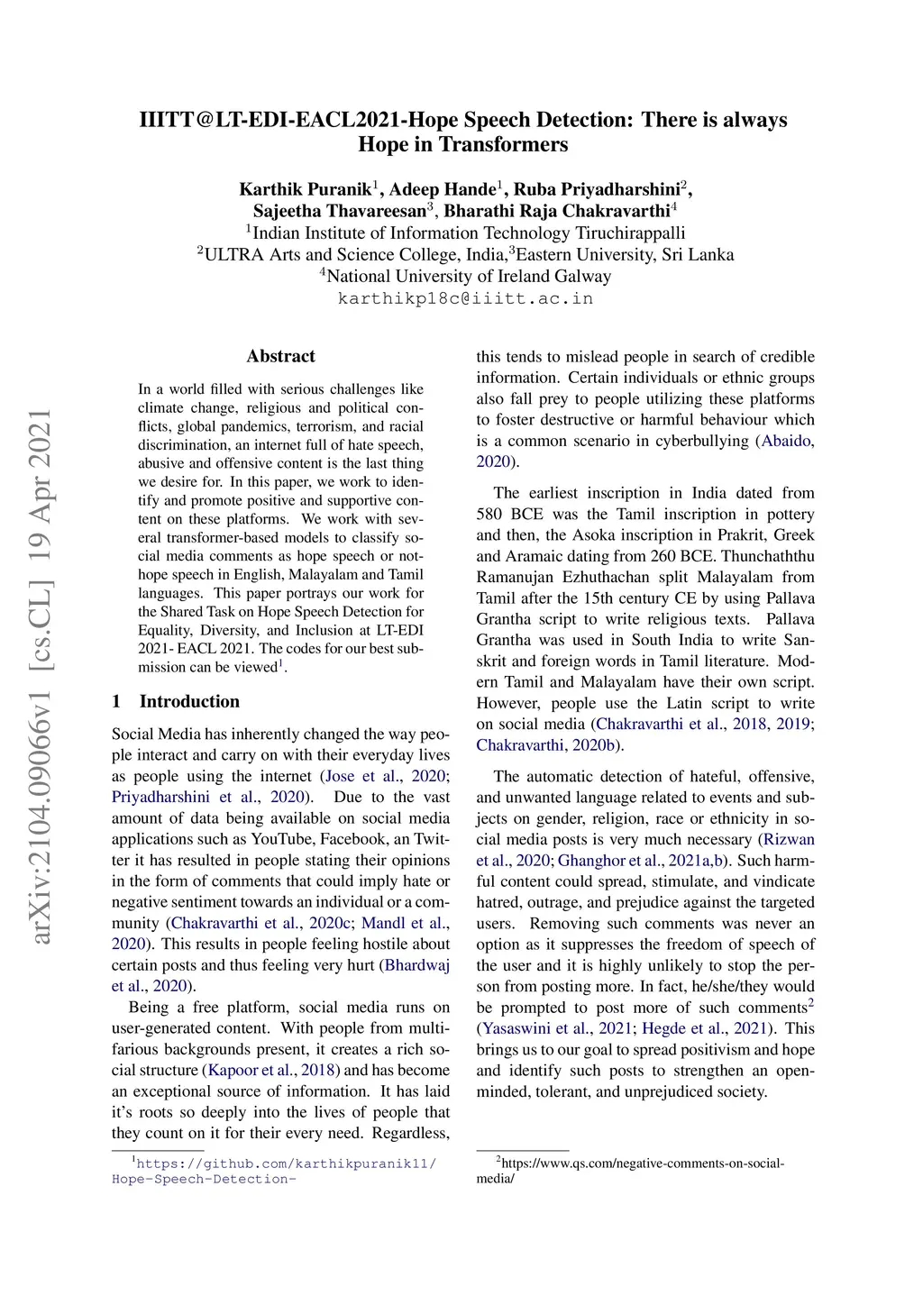 In a world filled with serious challenges like climate change, religious and political conflicts, global pandemics, terrorism, and racial discrimination, an internet full of hate speech, abusive and offensive content is the last thing we desire for. In this paper, we work to identify and promote positive and supportive content on these platforms. We work with several transformer-based models to classify social media comments as hope speech or not-hope speech in English, Malayalam and Tamil languages. This paper portrays our work for the Shared Task on Hope Speech Detection for Equality, Diversity, and Inclusion at LT-EDI 2021- EACL 2021.