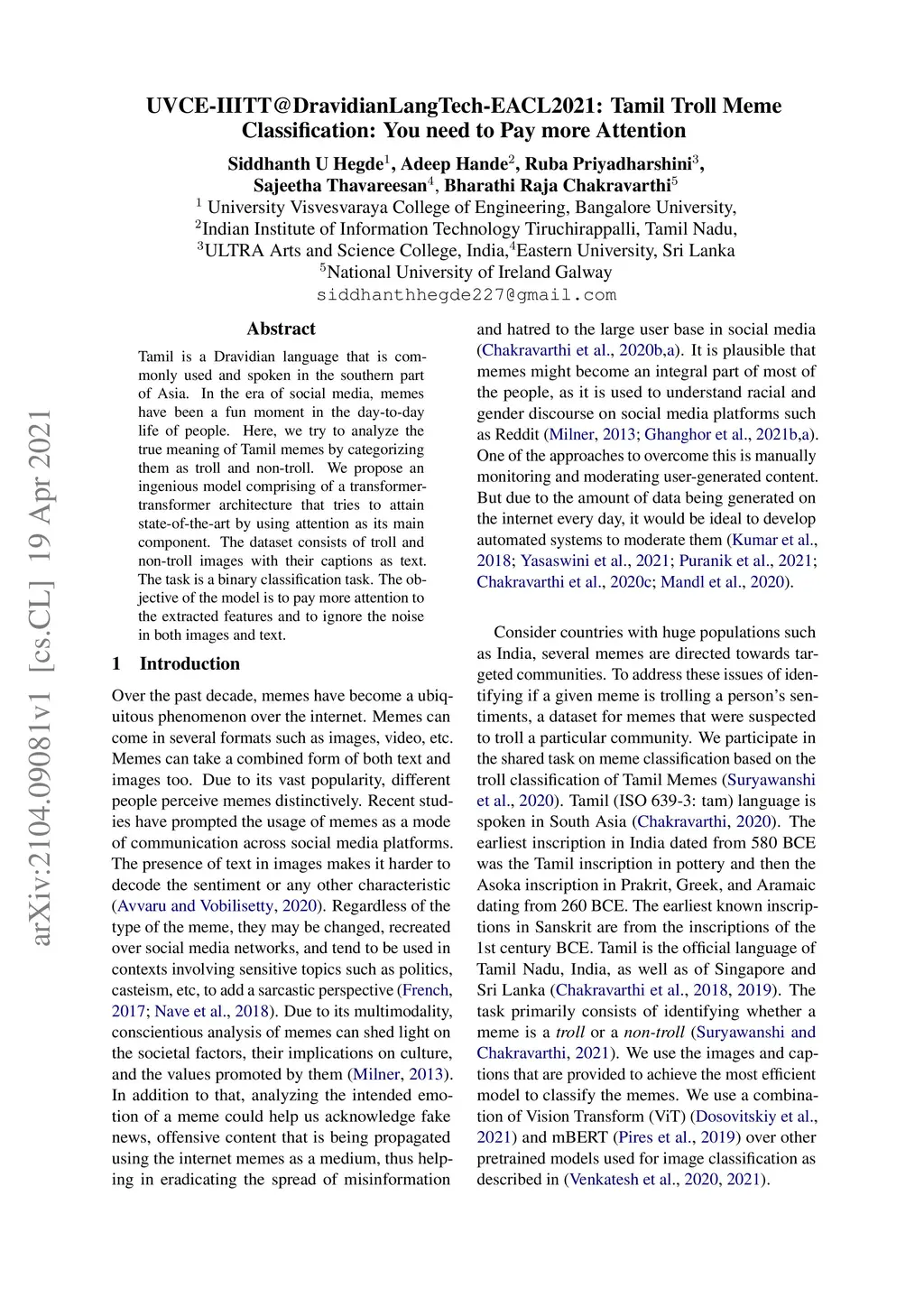 Tamil is a Dravidian language that is commonly used and spoken in the southern part of Asia. In the era of social media, memes have been a fun moment in the day-to-day life of people. Here, we try to analyze the true meaning of Tamil memes by categorizing them as troll and non-troll. We propose an ingenious model comprising of a transformer-transformer architecture that tries to attain state-of-the-art by using attention as its main component. The dataset consists of troll and non-troll images with their captions as text. The task is a binary classification task. The objective of the model is to pay more attention to the extracted features and to ignore the noise in both images and text.
