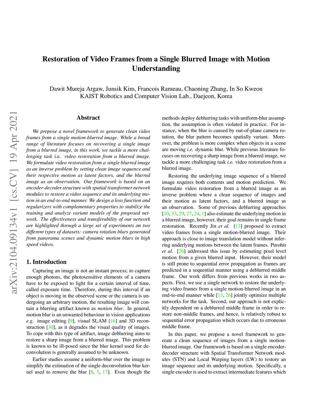 Restoration of Video Frames from a Single Blurred Image with Motion