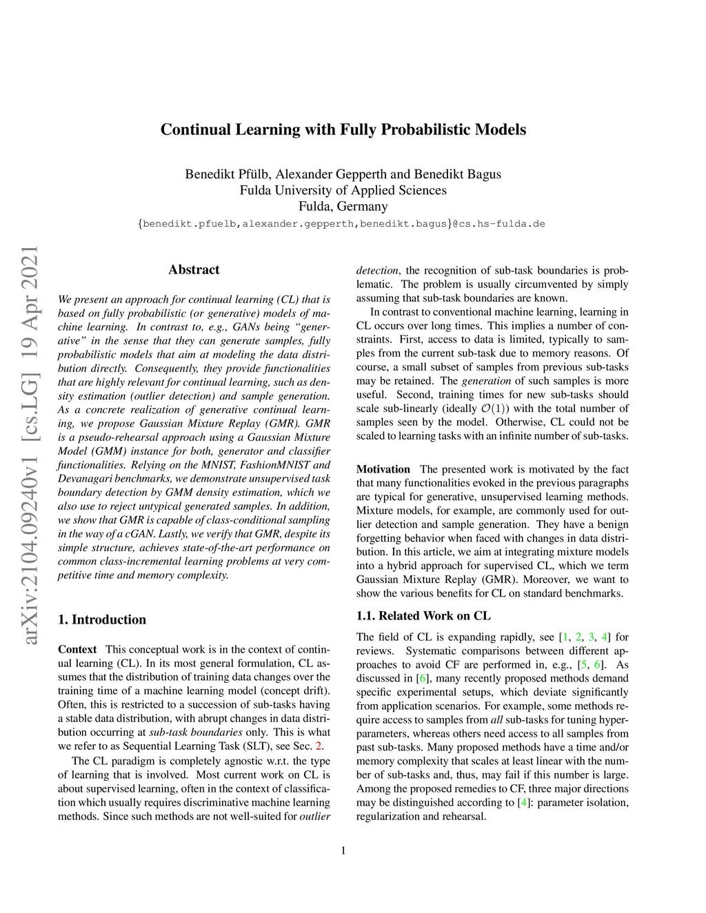 We present an approach for continual learning (CL) that is based on fully probabilistic (or generative) models of machine learning. In contrast to, e.g., GANs that are "generative" in the sense that they can generate samples, fully probabilistic models aim at modeling the data distribution directly. Consequently, they provide functionalities that are highly relevant for continual learning, such as density estimation (outlier detection) and sample generation. As a concrete realization of generative continual learning, we propose Gaussian Mixture Replay (GMR). GMR is a pseudo-rehearsal approach using a Gaussian Mixture Model (GMM) instance for both generator and classifier functionalities. Relying on the MNIST, FashionMNIST and Devanagari benchmarks, we first demonstrate unsupervised task boundary detection by GMM density estimation, which we also use to reject untypical generated samples. In addition, we show that GMR is capable of class-conditional sampling in the way of a cGAN. Lastly, we verify that GMR, despite its simple structure, achieves state-of-the-art performance on common class-incremental learning problems at very competitive time and memory complexity.