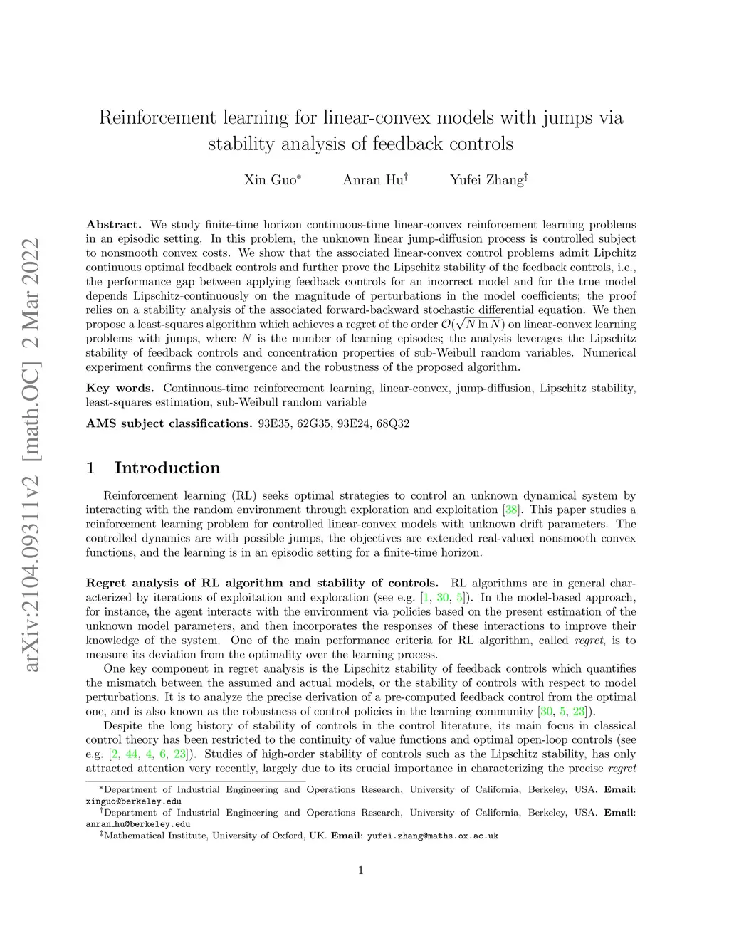 We study finite-time horizon continuous-time linear-convex reinforcement learning problems in an episodic setting. In this problem, the unknown linear jump-diffusion process is controlled subject to nonsmooth convex costs. We show that the associated linear-convex control problems admit Lipchitz continuous optimal feedback controls and further prove the Lipschitz stability of the feedback controls, i.e., the performance gap between applying feedback controls for an incorrect model and for the true model depends Lipschitz-continuously on the magnitude of perturbations in the model coefficients; the proof relies on a stability analysis of the associated forward-backward stochastic differential equation. We then propose a novel least-squares algorithm which achieves a regret of the order on linear-convex learning problems with jumps, where is the number of learning episodes; the analysis leverages the Lipschitz stability of feedback controls and concentration properties of sub-Weibull random variables. Numerical experiment confirms the convergence and the robustness of the proposed algorithm.