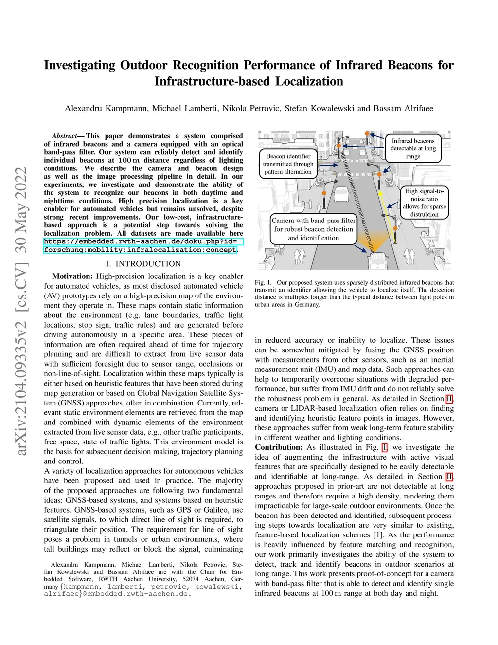 This paper demonstrates a system comprised of infrared beacons and a camera equipped with an optical band-pass filter. Our system can reliably detect and identify individual beacons at 100m distance regardless of lighting conditions. We describe the camera and beacon design as well as the image processing pipeline in detail. In our experiments, we investigate and demonstrate the ability of the system to recognize our beacons in both daytime and nighttime conditions. High precision localization is a key enabler for automated vehicles but remains unsolved, despite strong recent improvements. Our low-cost, infrastructure-based approach is a potential step towards solving the localization problem. All datasets are made available here https://embedded.rwth-aachen.de/doku.php?id=forschung:mobility:infralocalization:concept.