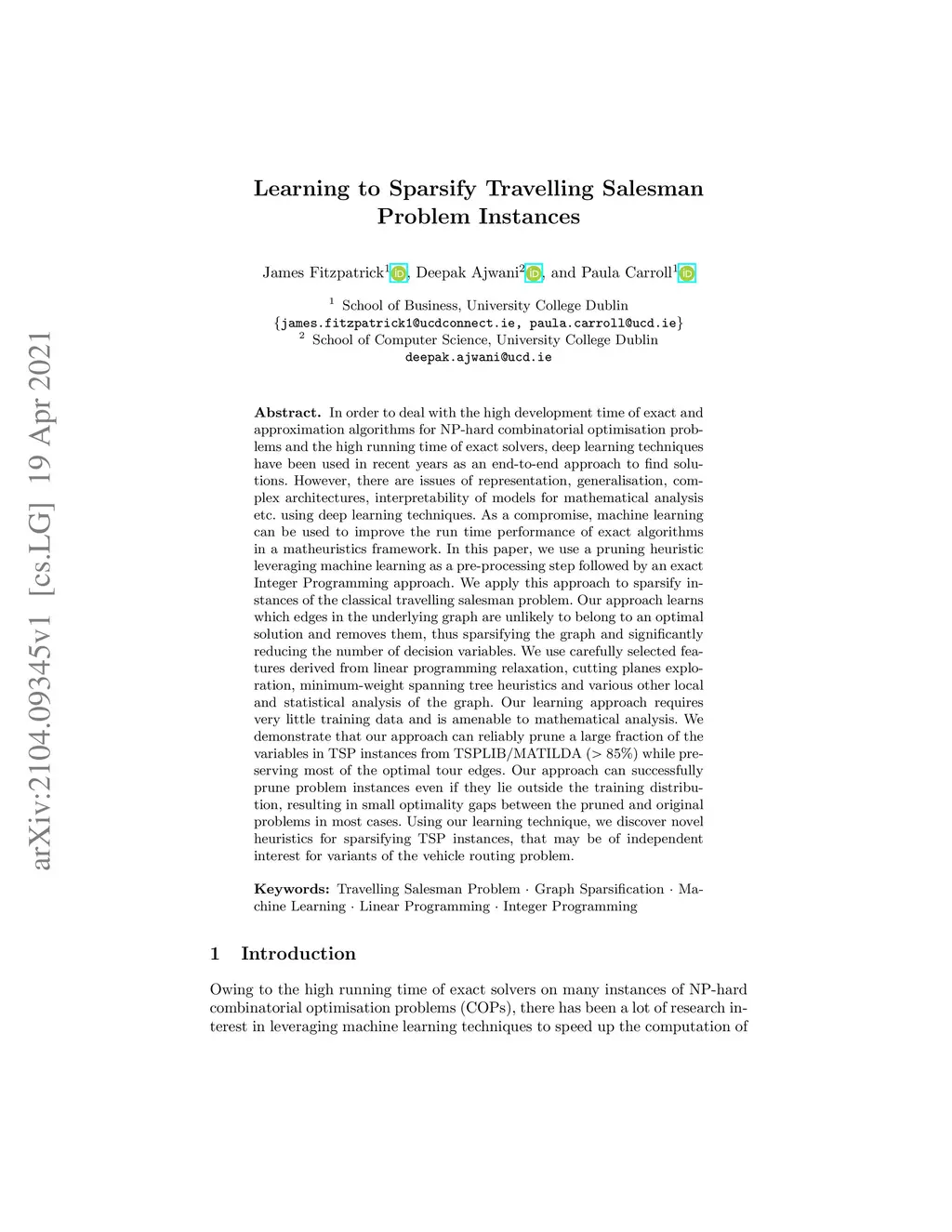 In order to deal with the high development time of exact and approximation algorithms for NP-hard combinatorial optimisation problems and the high running time of exact solvers, deep learning techniques have been used in recent years as an end-to-end approach to find solutions. However, there are issues of representation, generalisation, complex architectures, interpretability of models for mathematical analysis etc. using deep learning techniques. As a compromise, machine learning can be used to improve the run time performance of exact algorithms in a matheuristics framework. In this paper, we use a pruning heuristic leveraging machine learning as a pre-processing step followed by an exact Integer Programming approach. We apply this approach to sparsify instances of the classical travelling salesman problem. Our approach learns which edges in the underlying graph are unlikely to belong to an optimal solution and removes them, thus sparsifying the graph and significantly reducing the number of decision variables. We use carefully selected features derived from linear programming relaxation, cutting planes exploration, minimum-weight spanning tree heuristics and various other local and statistical analysis of the graph. Our learning approach requires very little training data and is amenable to mathematical analysis. We demonstrate that our approach can reliably prune a large fraction of the variables in TSP instances from TSPLIB/MATILDA (>85%$) while preserving most of the optimal tour edges. Our approach can successfully prune problem instances even if they lie outside the training distribution, resulting in small optimality gaps between the pruned and original problems in most cases. Using our learning technique, we discover novel heuristics for sparsifying TSP instances, that may be of independent interest for variants of the vehicle routing problem.