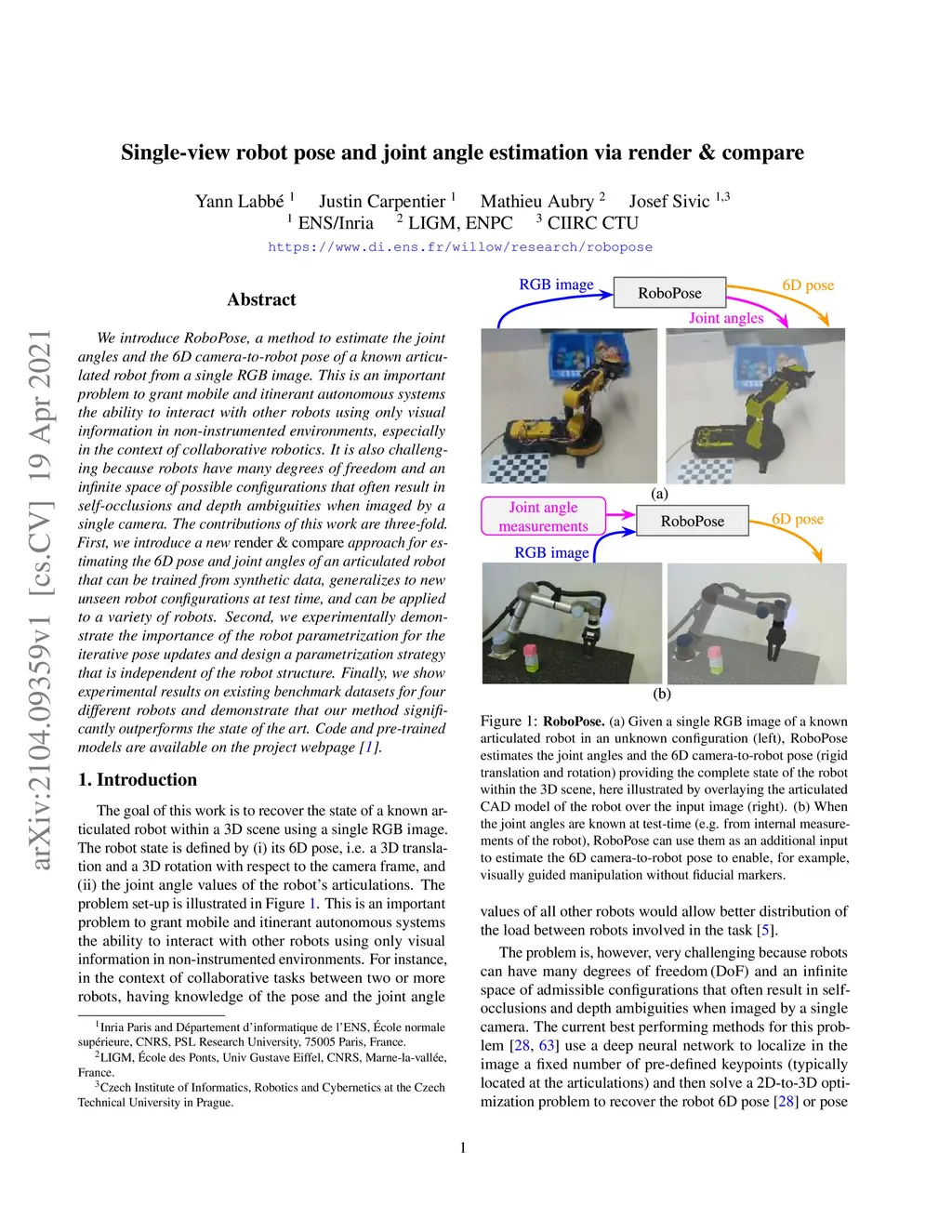 We introduce RoboPose, a method to estimate the joint angles and the 6D camera-to-robot pose of a known articulated robot from a single RGB image. This is an important problem to grant mobile and itinerant autonomous systems the ability to interact with other robots using only visual information in non-instrumented environments, especially in the context of collaborative robotics. It is also challenging because robots have many degrees of freedom and an infinite space of possible configurations that often result in self-occlusions and depth ambiguities when imaged by a single camera. The contributions of this work are three-fold. First, we introduce a new render & compare approach for estimating the 6D pose and joint angles of an articulated robot that can be trained from synthetic data, generalizes to new unseen robot configurations at test time, and can be applied to a variety of robots. Second, we experimentally demonstrate the importance of the robot parametrization for the iterative pose updates and design a parametrization strategy that is independent of the robot structure. Finally, we show experimental results on existing benchmark datasets for four different robots and demonstrate that our method significantly outperforms the state of the art. Code and pre-trained models are available on the project webpage https://www.di.ens.fr/willow/research/robopose/.