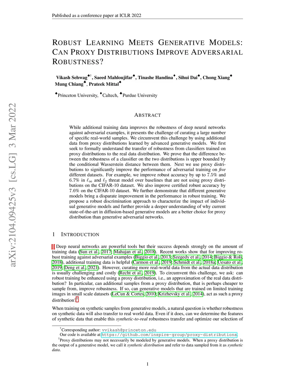 While additional training data improves the robustness of deep neural networks against adversarial examples, it presents the challenge of curating a large number of specific real-world samples. We circumvent this challenge by using additional data from proxy distributions learned by advanced generative models. We first seek to formally understand the transfer of robustness from classifiers trained on proxy distributions to the real data distribution. We prove that the difference between the robustness of a classifier on the two distributions is upper bounded by the conditional Wasserstein distance between them. Next we use proxy distributions to significantly improve the performance of adversarial training on five different datasets. For example, we improve robust accuracy by up to 7.5% and 6.7% in and threat model over baselines that are not using proxy distributions on the CIFAR-10 dataset. We also improve certified robust accuracy by 7.6% on the CIFAR-10 dataset. We further demonstrate that different generative models bring a disparate improvement in the performance in robust training. We propose a robust discrimination approach to characterize the impact of individual generative models and further provide a deeper understanding of why current state-of-the-art in diffusion-based generative models are a better choice for proxy distribution than generative adversarial networks.