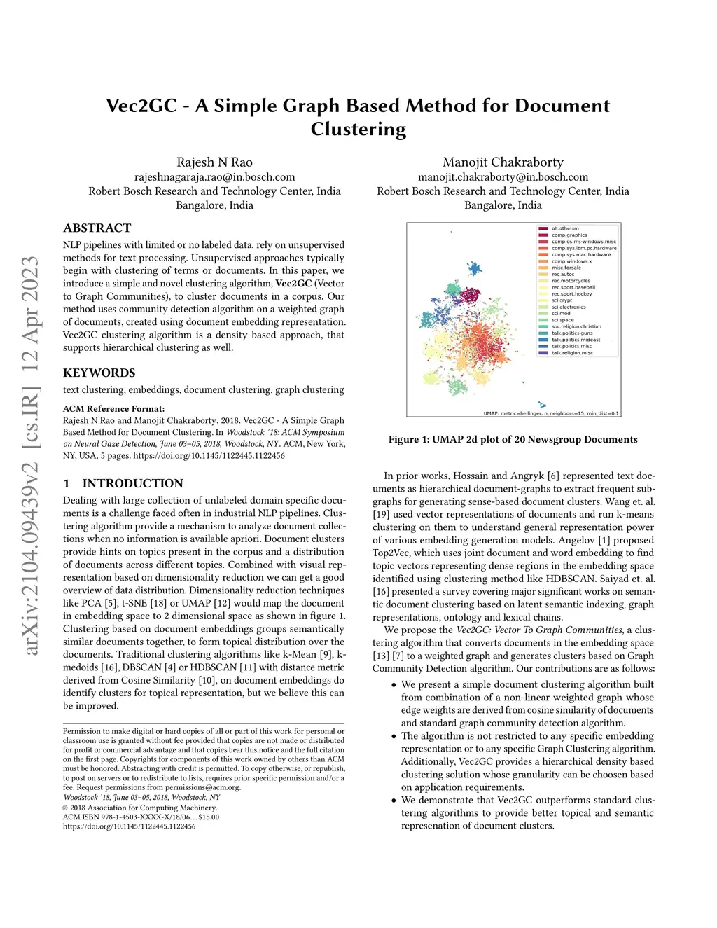 Vec2GC -- A Graph Based Clustering Method for Text Representations