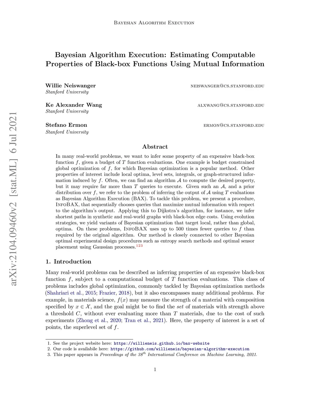 In many real-world problems, we want to infer some property of an expensive black-box function , given a budget of function evaluations. One example is budget constrained global optimization of , for which Bayesian optimization is a popular method. Other properties of interest include local optima, level sets, integrals, or graph-structured information induced by . Often, we can find an algorithm to compute the desired property, but it may require far more than queries to execute. Given such an , and a prior distribution over , we refer to the problem of inferring the output of using evaluations as Bayesian Algorithm Execution (BAX). To tackle this problem, we present a procedure, InfoBAX, that sequentially chooses queries that maximize mutual information with respect to the algorithm's output. Applying this to Dijkstra's algorithm, for instance, we infer shortest paths in synthetic and real-world graphs with black-box edge costs. Using evolution strategies, we yield variants of Bayesian optimization that target local, rather than global, optima. On these problems, InfoBAX uses up to 500 times fewer queries to than required by the original algorithm. Our method is closely connected to other Bayesian optimal experimental design procedures such as entropy search methods and optimal sensor placement using Gaussian processes.