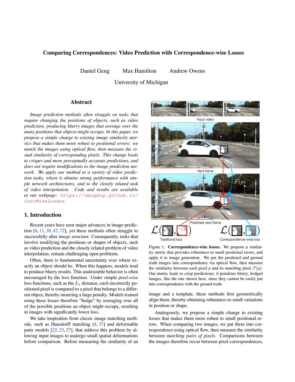 Image prediction methods often struggle on tasks that require changing the positions of objects, such as video prediction, producing blurry images that average over the many positions that objects might occupy. In this paper, we propose a simple change to existing image similarity metrics that makes them more robust to positional errors: we match the images using optical flow, then measure the visual similarity of corresponding pixels. This change leads to crisper and more perceptually accurate predictions, and does not require modifications to the image prediction network. We apply our method to a variety of video prediction tasks, where it obtains strong performance with simple network architectures, and to the closely related task of video interpolation. Code and results are available at our webpage: https://dangeng.github.io/CorrWiseLosses