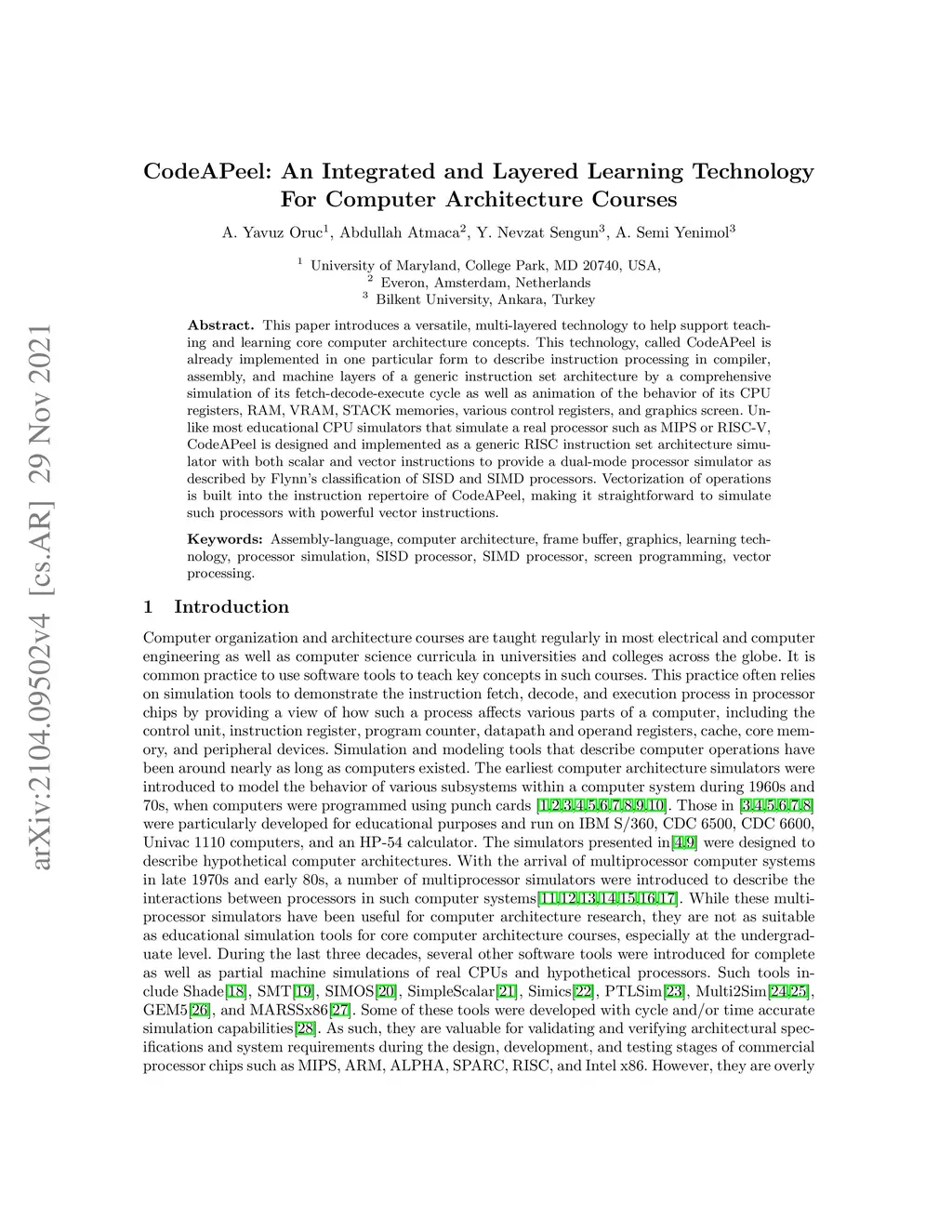 This paper introduces a versatile, multi-layered technology to help support teaching and learning core computer architecture concepts. This technology, called CodeAPeel is already implemented in one particular form to describe instruction processing in compiler, assembly, and machine layers of a generic instruction set architecture by a comprehensive simulation of its fetch-decode-execute cycle as well as animation of the behavior of its CPU registers, RAM, VRAM, STACK memories, various control registers, and graphics screen. Unlike most educational CPU simulators that simulate a real processor such as MIPS or RISC-V, CodeAPeel is designed and implemented as a generic RISC instruction set architecture simulator with both scalar and vector instructions to provide a dual-mode processor simulator as described by Flynn's classification of SISD and SIMD processors. Vectorization of operations is built into the instruction repertoire of CodeAPeel, making it straightforward to simulate such processors with powerful vector instructions.