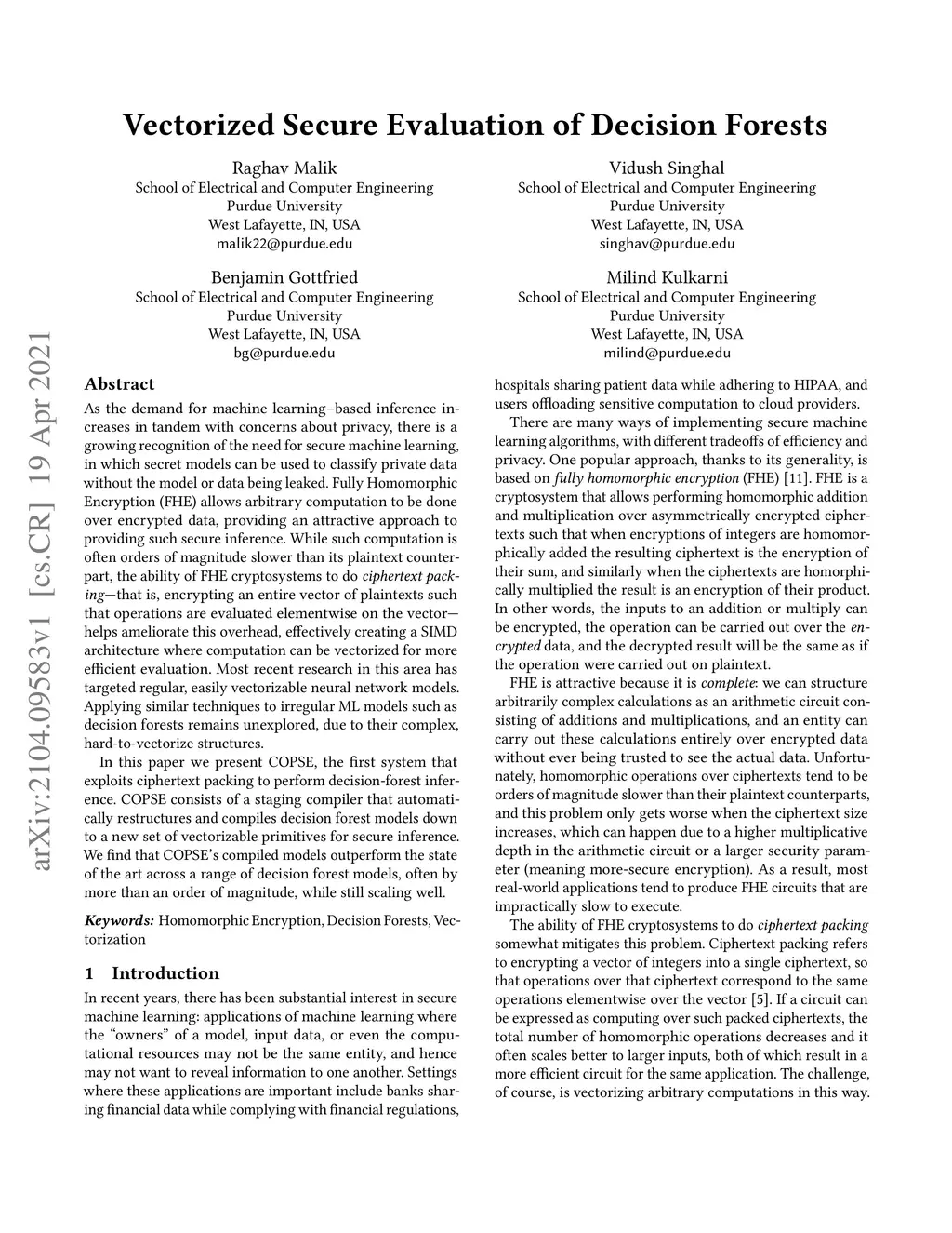 As the demand for machine learning-based inference increases in tandem with concerns about privacy, there is a growing recognition of the need for secure machine learning, in which secret models can be used to classify private data without the model or data being leaked. Fully Homomorphic Encryption (FHE) allows arbitrary computation to be done over encrypted data, providing an attractive approach to providing such secure inference. While such computation is often orders of magnitude slower than its plaintext counterpart, the ability of FHE cryptosystems to do \emph{ciphertext packing} -- that is, encrypting an entire vector of plaintexts such that operations are evaluated elementwise on the vector -- helps ameliorate this overhead, effectively creating a SIMD architecture where computation can be vectorized for more efficient evaluation. Most recent research in this area has targeted regular, easily vectorizable neural network models. Applying similar techniques to irregular ML models such as decision forests remains unexplored, due to their complex, hard-to-vectorize structures. In this paper we present COPSE, the first system that exploits ciphertext packing to perform decision-forest inference. COPSE consists of a staging compiler that automatically restructures and compiles decision forest models down to a new set of vectorizable primitives for secure inference. We find that COPSE's compiled models outperform the state of the art across a range of decision forest models, often by more than an order of magnitude, while still scaling well.