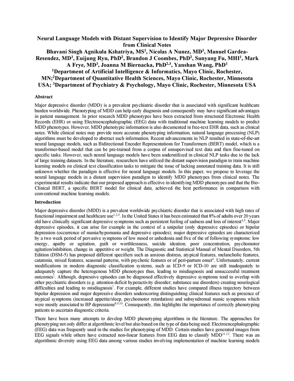 Major depressive disorder (MDD) is a prevalent psychiatric disorder that is associated with significant healthcare burden worldwide. Phenotyping of MDD can help early diagnosis and consequently may have significant advantages in patient management. In prior research MDD phenotypes have been extracted from structured Electronic Health Records (EHR) or using Electroencephalographic (EEG) data with traditional machine learning models to predict MDD phenotypes. However, MDD phenotypic information is also documented in free-text EHR data, such as clinical notes. While clinical notes may provide more accurate phenotyping information, natural language processing (NLP) algorithms must be developed to abstract such information. Recent advancements in NLP resulted in state-of-the-art neural language models, such as Bidirectional Encoder Representations for Transformers (BERT) model, which is a transformer-based model that can be pre-trained from a corpus of unsupervised text data and then fine-tuned on specific tasks. However, such neural language models have been underutilized in clinical NLP tasks due to the lack of large training datasets. In the literature, researchers have utilized the distant supervision paradigm to train machine learning models on clinical text classification tasks to mitigate the issue of lacking annotated training data. It is still unknown whether the paradigm is effective for neural language models. In this paper, we propose to leverage the neural language models in a distant supervision paradigm to identify MDD phenotypes from clinical notes. The experimental results indicate that our proposed approach is effective in identifying MDD phenotypes and that the Bio- Clinical BERT, a specific BERT model for clinical data, achieved the best performance in comparison with conventional machine learning models.