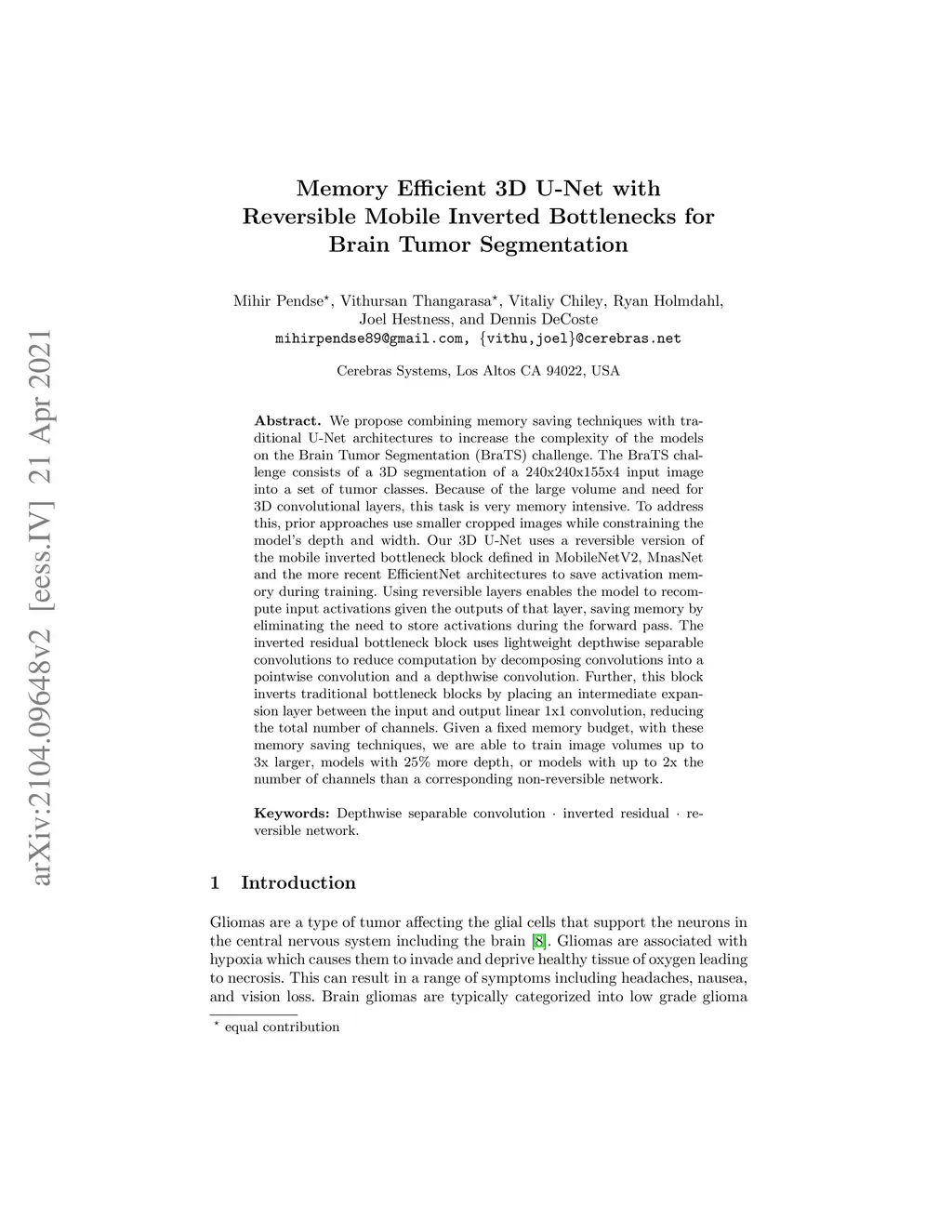 We propose combining memory saving techniques with traditional U-Net architectures to increase the complexity of the models on the Brain Tumor Segmentation (BraTS) challenge. The BraTS challenge consists of a 3D segmentation of a 240x240x155x4 input image into a set of tumor classes. Because of the large volume and need for 3D convolutional layers, this task is very memory intensive. To address this, prior approaches use smaller cropped images while constraining the model's depth and width. Our 3D U-Net uses a reversible version of the mobile inverted bottleneck block defined in MobileNetV2, MnasNet and the more recent EfficientNet architectures to save activation memory during training. Using reversible layers enables the model to recompute input activations given the outputs of that layer, saving memory by eliminating the need to store activations during the forward pass. The inverted residual bottleneck block uses lightweight depthwise separable convolutions to reduce computation by decomposing convolutions into a pointwise convolution and a depthwise convolution. Further, this block inverts traditional bottleneck blocks by placing an intermediate expansion layer between the input and output linear 1x1 convolution, reducing the total number of channels. Given a fixed memory budget, with these memory saving techniques, we are able to train image volumes up to 3x larger, models with 25% more depth, or models with up to 2x the number of channels than a corresponding non-reversible network.