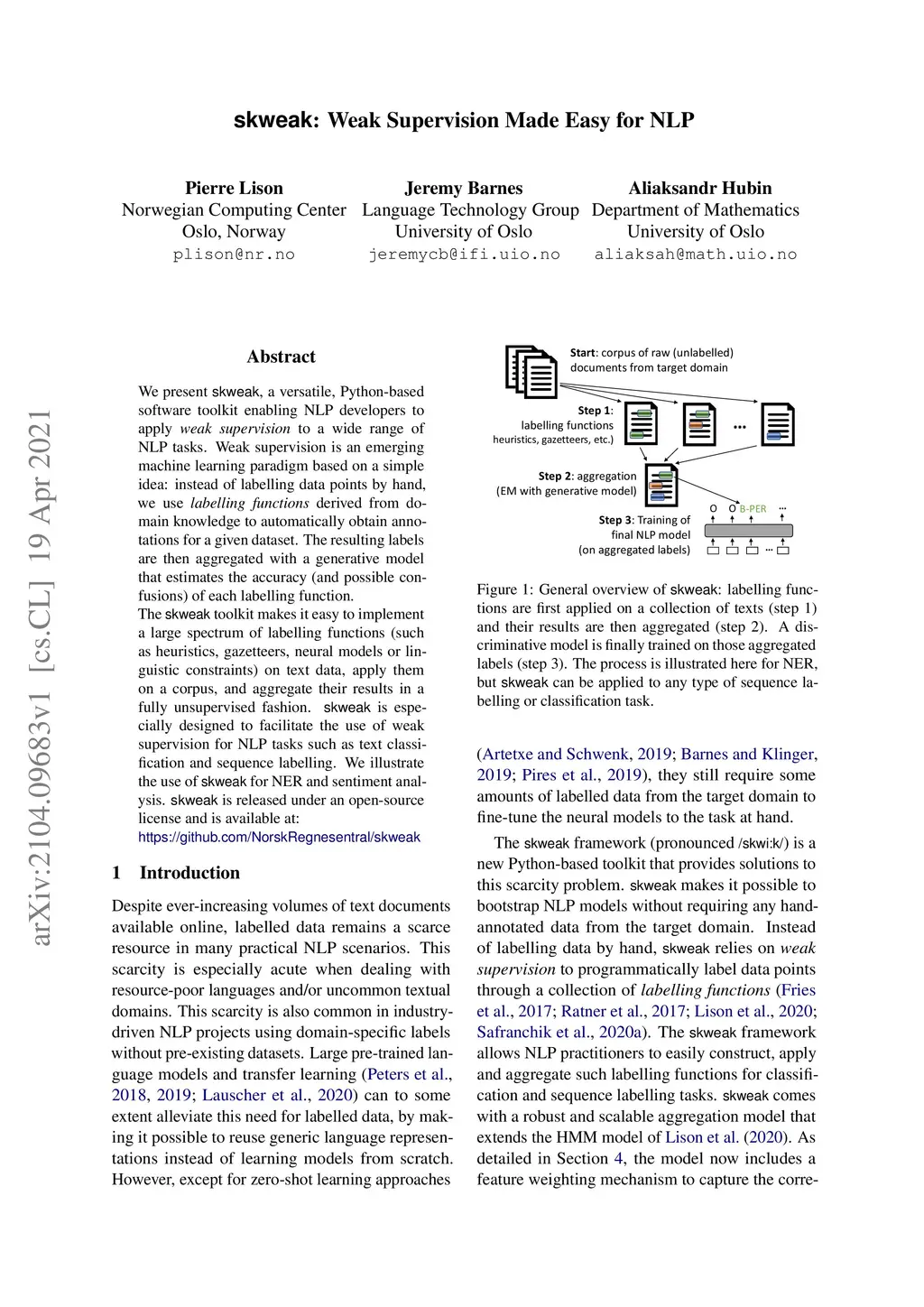 We present skweak, a versatile, Python-based software toolkit enabling NLP developers to apply weak supervision to a wide range of NLP tasks. Weak supervision is an emerging machine learning paradigm based on a simple idea: instead of labelling data points by hand, we use labelling functions derived from domain knowledge to automatically obtain annotations for a given dataset. The resulting labels are then aggregated with a generative model that estimates the accuracy (and possible confusions) of each labelling function. The skweak toolkit makes it easy to implement a large spectrum of labelling functions (such as heuristics, gazetteers, neural models or linguistic constraints) on text data, apply them on a corpus, and aggregate their results in a fully unsupervised fashion. skweak is especially designed to facilitate the use of weak supervision for NLP tasks such as text classification and sequence labelling. We illustrate the use of skweak for NER and sentiment analysis. skweak is released under an open-source license and is available at: https://github.com/NorskRegnesentral/skweak