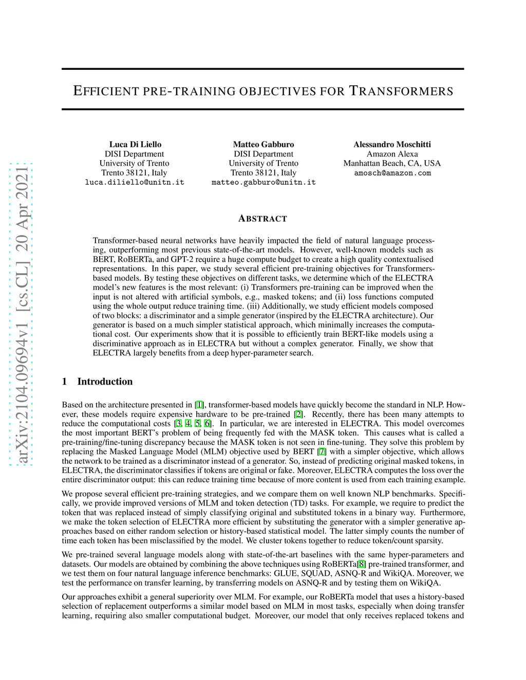 The Transformer architecture deeply changed the natural language processing, outperforming all previous state-of-the-art models. However, well-known Transformer models like BERT, RoBERTa, and GPT-2 require a huge compute budget to create a high quality contextualised representation. In this paper, we study several efficient pre-training objectives for Transformers-based models. By testing these objectives on different tasks, we determine which of the ELECTRA model's new features is the most relevant. We confirm that Transformers pre-training is improved when the input does not contain masked tokens and that the usage of the whole output to compute the loss reduces training time. Moreover, inspired by ELECTRA, we study a model composed of two blocks; a discriminator and a simple generator based on a statistical model with no impact on the computational performances. Besides, we prove that eliminating the MASK token and considering the whole output during the loss computation are essential choices to improve performance. Furthermore, we show that it is possible to efficiently train BERT-like models using a discriminative approach as in ELECTRA but without a complex generator, which is expensive. Finally, we show that ELECTRA benefits heavily from a state-of-the-art hyper-parameters search.