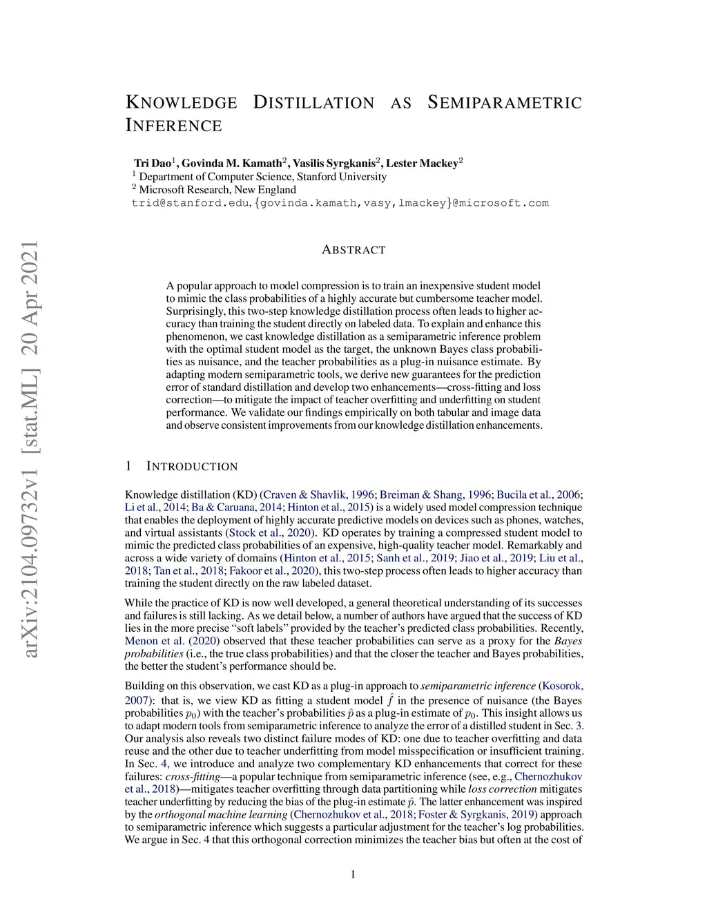 A popular approach to model compression is to train an inexpensive student model to mimic the class probabilities of a highly accurate but cumbersome teacher model. Surprisingly, this two-step knowledge distillation process often leads to higher accuracy than training the student directly on labeled data. To explain and enhance this phenomenon, we cast knowledge distillation as a semiparametric inference problem with the optimal student model as the target, the unknown Bayes class probabilities as nuisance, and the teacher probabilities as a plug-in nuisance estimate. By adapting modern semiparametric tools, we derive new guarantees for the prediction error of standard distillation and develop two enhancements -- cross-fitting and loss correction -- to mitigate the impact of teacher overfitting and underfitting on student performance. We validate our findings empirically on both tabular and image data and observe consistent improvements from our knowledge distillation enhancements.