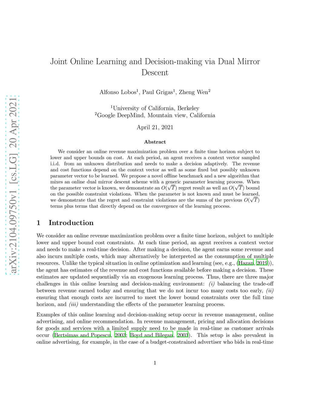 Joint Online Learning and Decision-making via Dual Mirror Descent
