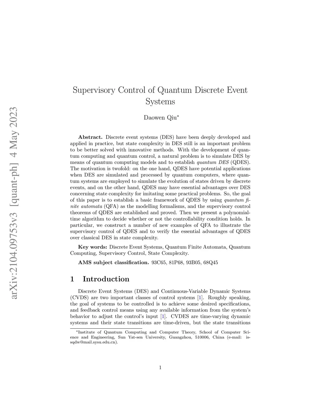 Discrete event systems (DES) have been deeply developed and applied in practice, but state complexity in DES still is an important problem to be better solved with innovative methods. With the development of quantum computing and quantum control, a natural problem is to simulate DES by means of quantum computing models and to establish {\it quantum DES} (QDES). The motivation is twofold: on the one hand, QDES have potential applications when DES are simulated and processed by quantum computers, where quantum systems are employed to simulate the evolution of states driven by discrete events, and on the other hand, QDES may have essential advantages over DES concerning state complexity for imitating some practical problems. So, the goal of this paper is to establish a basic framework of QDES by using {\it quantum finite automata} (QFA) as the modelling formalisms, and the supervisory control theorems of QDES are established and proved. Then we present a polynomial-time algorithm to decide whether or not the controllability condition holds. In particular, we construct a number of new examples of QFA to illustrate the supervisory control of QDES and to verify the essential advantages of QDES over classical DES in state complexity.