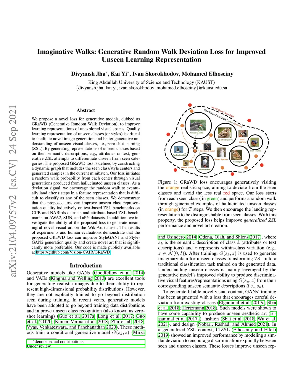 We propose a novel loss for generative models, dubbed as GRaWD (Generative Random Walk Deviation), to improve learning representations of unexplored visual spaces. Quality learning representation of unseen classes (or styles) is critical to facilitate novel image generation and better generative understanding of unseen visual classes, i.e., zero-shot learning (ZSL). By generating representations of unseen classes based on their semantic descriptions, e.g., attributes or text, generative ZSL attempts to differentiate unseen from seen categories. The proposed GRaWD loss is defined by constructing a dynamic graph that includes the seen class/style centers and generated samples in the current minibatch. Our loss initiates a random walk probability from each center through visual generations produced from hallucinated unseen classes. As a deviation signal, we encourage the random walk to eventually land after t steps in a feature representation that is difficult to classify as any of the seen classes. We demonstrate that the proposed loss can improve unseen class representation quality inductively on text-based ZSL benchmarks on CUB and NABirds datasets and attribute-based ZSL benchmarks on AWA2, SUN, and aPY datasets. In addition, we investigate the ability of the proposed loss to generate meaningful novel visual art on the WikiArt dataset. The results of experiments and human evaluations demonstrate that the proposed GRaWD loss can improve StyleGAN1 and StyleGAN2 generation quality and create novel art that is significantly more preferable. Our code is made publicly available at https://github.com/Vision-CAIR/GRaWD.