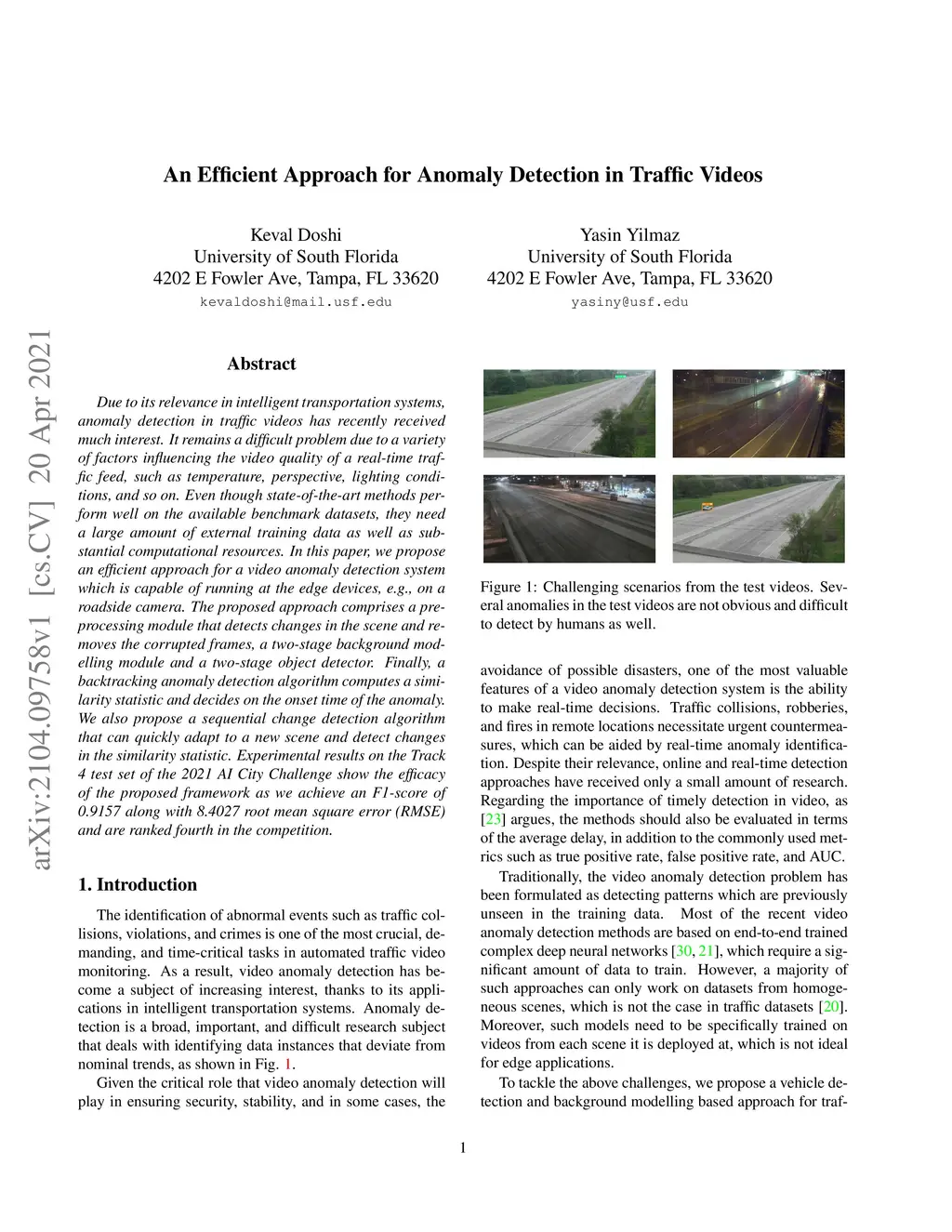 Due to its relevance in intelligent transportation systems, anomaly detection in traffic videos has recently received much interest. It remains a difficult problem due to a variety of factors influencing the video quality of a real-time traffic feed, such as temperature, perspective, lighting conditions, and so on. Even though state-of-the-art methods perform well on the available benchmark datasets, they need a large amount of external training data as well as substantial computational resources. In this paper, we propose an efficient approach for a video anomaly detection system which is capable of running at the edge devices, e.g., on a roadside camera. The proposed approach comprises a pre-processing module that detects changes in the scene and removes the corrupted frames, a two-stage background modelling module and a two-stage object detector. Finally, a backtracking anomaly detection algorithm computes a similarity statistic and decides on the onset time of the anomaly. We also propose a sequential change detection algorithm that can quickly adapt to a new scene and detect changes in the similarity statistic. Experimental results on the Track 4 test set of the 2021 AI City Challenge show the efficacy of the proposed framework as we achieve an F1-score of 0.9157 along with 8.4027 root mean square error (RMSE) and are ranked fourth in the competition.