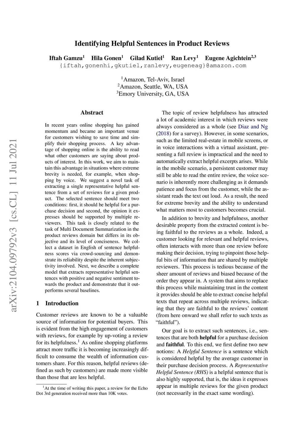 In recent years online shopping has gained momentum and became an important venue for customers wishing to save time and simplify their shopping process. A key advantage of shopping online is the ability to read what other customers are saying about products of interest. In this work, we aim to maintain this advantage in situations where extreme brevity is needed, for example, when shopping by voice. We suggest a novel task of extracting a single representative helpful sentence from a set of reviews for a given product. The selected sentence should meet two conditions: first, it should be helpful for a purchase decision and second, the opinion it expresses should be supported by multiple reviewers. This task is closely related to the task of Multi Document Summarization in the product reviews domain but differs in its objective and its level of conciseness. We collect a dataset in English of sentence helpfulness scores via crowd-sourcing and demonstrate its reliability despite the inherent subjectivity involved. Next, we describe a complete model that extracts representative helpful sentences with positive and negative sentiment towards the product and demonstrate that it outperforms several baselines.