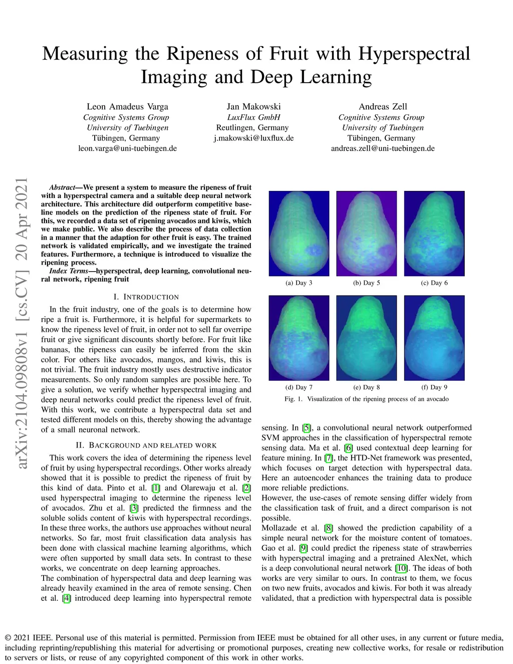 We present a system to measure the ripeness of fruit with a hyperspectral camera and a suitable deep neural network architecture. This architecture did outperform competitive baseline models on the prediction of the ripeness state of fruit. For this, we recorded a data set of ripening avocados and kiwis, which we make public. We also describe the process of data collection in a manner that the adaption for other fruit is easy. The trained network is validated empirically, and we investigate the trained features. Furthermore, a technique is introduced to visualize the ripening process.