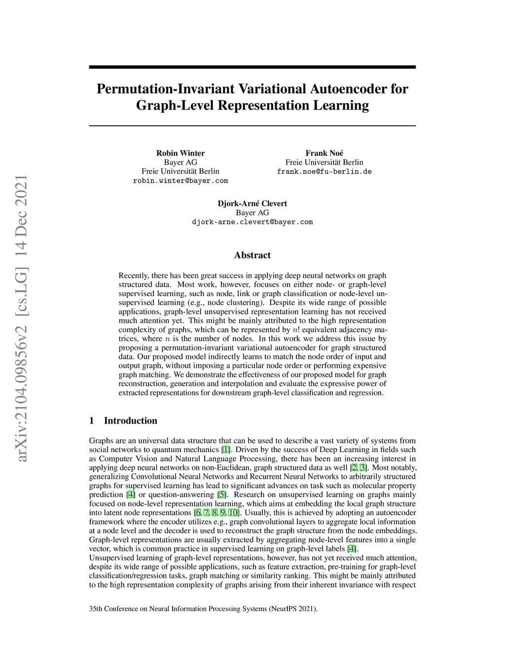 Recently, there has been great success in applying deep neural networks on graph structured data. Most work, however, focuses on either node- or graph-level supervised learning, such as node, link or graph classification or node-level unsupervised learning (e.g. node clustering). Despite its wide range of possible applications, graph-level unsupervised learning has not received much attention yet. This might be mainly attributed to the high representation complexity of graphs, which can be represented by n! equivalent adjacency matrices, where n is the number of nodes. In this work we address this issue by proposing a permutation-invariant variational autoencoder for graph structured data. Our proposed model indirectly learns to match the node ordering of input and output graph, without imposing a particular node ordering or performing expensive graph matching. We demonstrate the effectiveness of our proposed model on various graph reconstruction and generation tasks and evaluate the expressive power of extracted representations for downstream graph-level classification and regression.