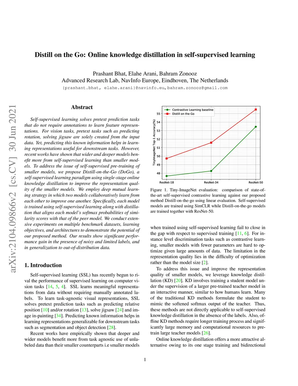 Self-supervised learning solves pretext prediction tasks that do not require annotations to learn feature representations. For vision tasks, pretext tasks such as predicting rotation, solving jigsaw are solely created from the input data. Yet, predicting this known information helps in learning representations useful for downstream tasks. However, recent works have shown that wider and deeper models benefit more from self-supervised learning than smaller models. To address the issue of self-supervised pre-training of smaller models, we propose Distill-on-the-Go (DoGo), a self-supervised learning paradigm using single-stage online knowledge distillation to improve the representation quality of the smaller models. We employ deep mutual learning strategy in which two models collaboratively learn from each other to improve one another. Specifically, each model is trained using self-supervised learning along with distillation that aligns each model's softmax probabilities of similarity scores with that of the peer model. We conduct extensive experiments on multiple benchmark datasets, learning objectives, and architectures to demonstrate the potential of our proposed method. Our results show significant performance gain in the presence of noisy and limited labels and generalization to out-of-distribution data.