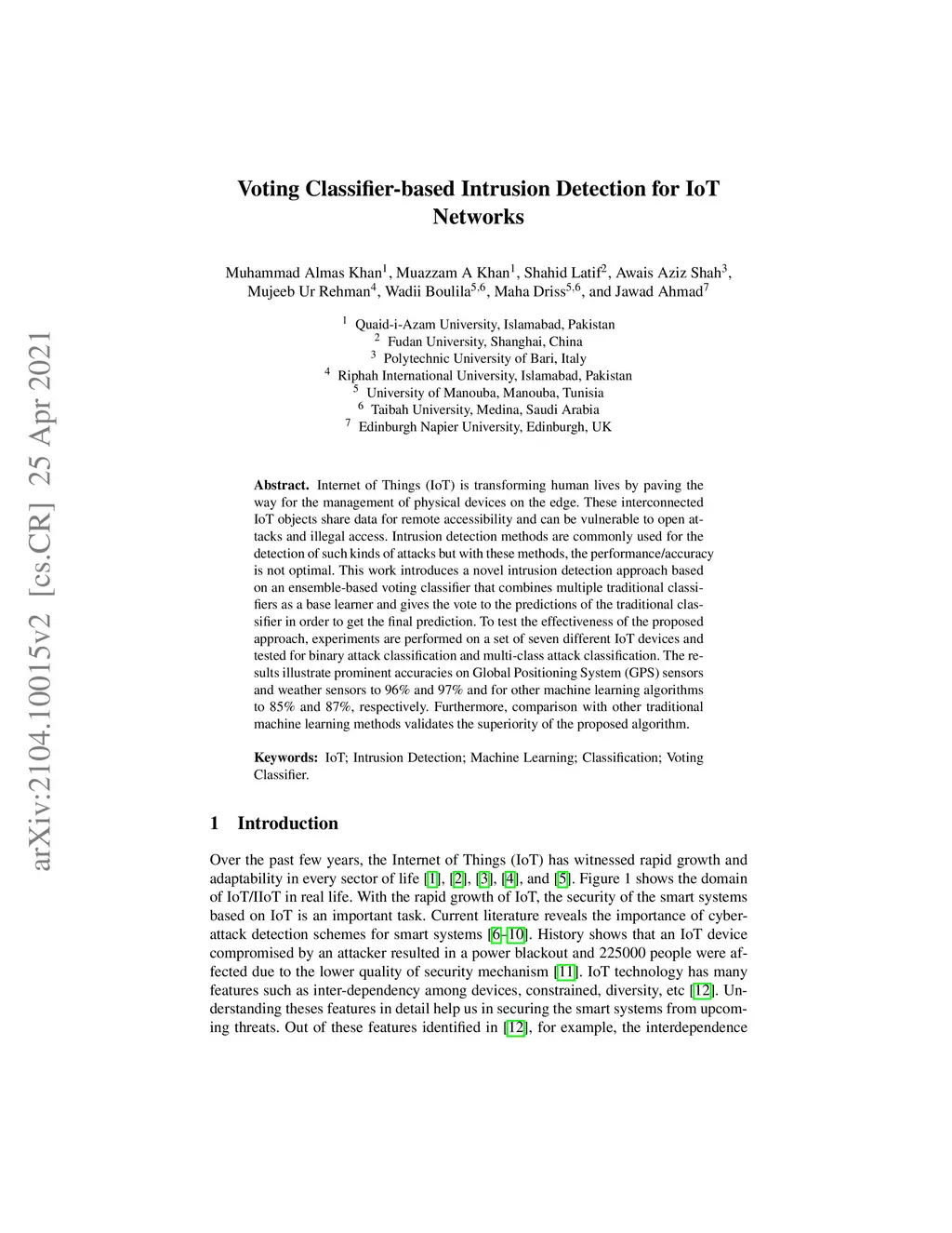 Internet of Things (IoT) is transforming human lives by paving the way for the management of physical devices on the edge. These interconnected IoT objects share data for remote accessibility and can be vulnerable to open attacks and illegal access. Intrusion detection methods are commonly used for the detection of such kinds of attacks but with these methods, the performance/accuracy is not optimal. This work introduces a novel intrusion detection approach based on an ensemble-based voting classifier that combines multiple traditional classifiers as a base learner and gives the vote to the predictions of the traditional classifier in order to get the final prediction. To test the effectiveness of the proposed approach, experiments are performed on a set of seven different IoT devices and tested for binary attack classification and multi-class attack classification. The results illustrate prominent accuracies on Global Positioning System (GPS) sensors and weather sensors to 96% and 97% and for other machine learning algorithms to 85% and 87%, respectively. Furthermore, comparison with other traditional machine learning methods validates the superiority of the proposed algorithm.