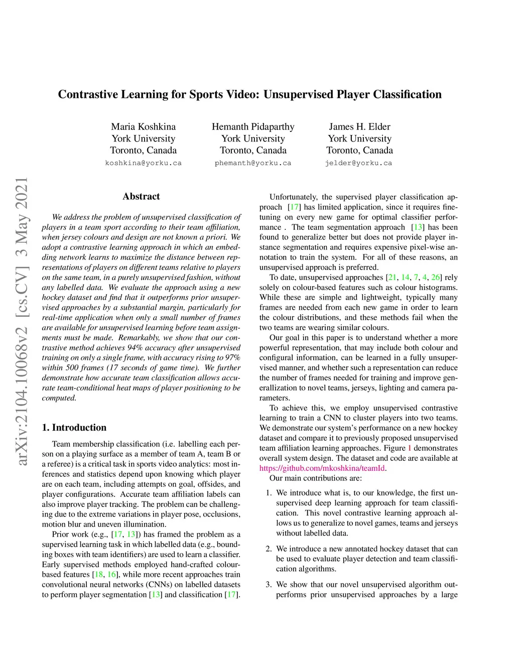 We address the problem of unsupervised classification of players in a team sport according to their team affiliation, when jersey colours and design are not known a priori. We adopt a contrastive learning approach in which an embedding network learns to maximize the distance between representations of players on different teams relative to players on the same team, in a purely unsupervised fashion, without any labelled data. We evaluate the approach using a new hockey dataset and find that it outperforms prior unsupervised approaches by a substantial margin, particularly for real-time application when only a small number of frames are available for unsupervised learning before team assignments must be made. Remarkably, we show that our contrastive method achieves 94% accuracy after unsupervised training on only a single frame, with accuracy rising to 97% within 500 frames (17 seconds of game time). We further demonstrate how accurate team classification allows accurate team-conditional heat maps of player positioning to be computed.