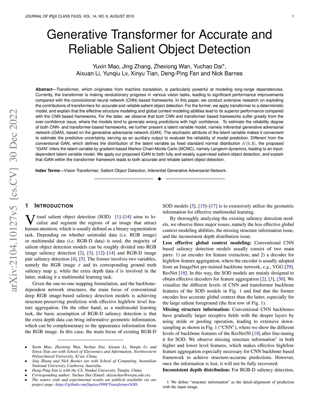 Transformer, which originates from machine translation, is particularly powerful at modeling long-range dependencies. Currently, the transformer is making revolutionary progress in various vision tasks, leading to significant performance improvements compared with the convolutional neural network (CNN) based frameworks. In this paper, we conduct extensive research on exploiting the contributions of transformers for accurate and reliable salient object detection. For the former, we apply transformer to a deterministic model, and explain that the effective structure modeling and global context modeling abilities lead to its superior performance compared with the CNN based frameworks. For the latter, we observe that both CNN and transformer based frameworks suffer greatly from the over-confidence issue, where the models tend to generate wrong predictions with high confidence. To estimate the reliability degree of both CNN- and transformer-based frameworks, we further present a latent variable model, namely inferential generative adversarial network (iGAN), based on the generative adversarial network (GAN). The stochastic attribute of the latent variable makes it convenient to estimate the predictive uncertainty, serving as an auxiliary output to evaluate the reliability of model prediction. Different from the conventional GAN, which defines the distribution of the latent variable as fixed standard normal distribution , the proposed iGAN infers the latent variable by gradient-based Markov Chain Monte Carlo (MCMC), namely Langevin dynamics, leading to an input-dependent latent variable model. We apply our proposed iGAN to both fully and weakly supervised salient object detection, and explain that iGAN within the transformer framework leads to both accurate and reliable salient object detection.