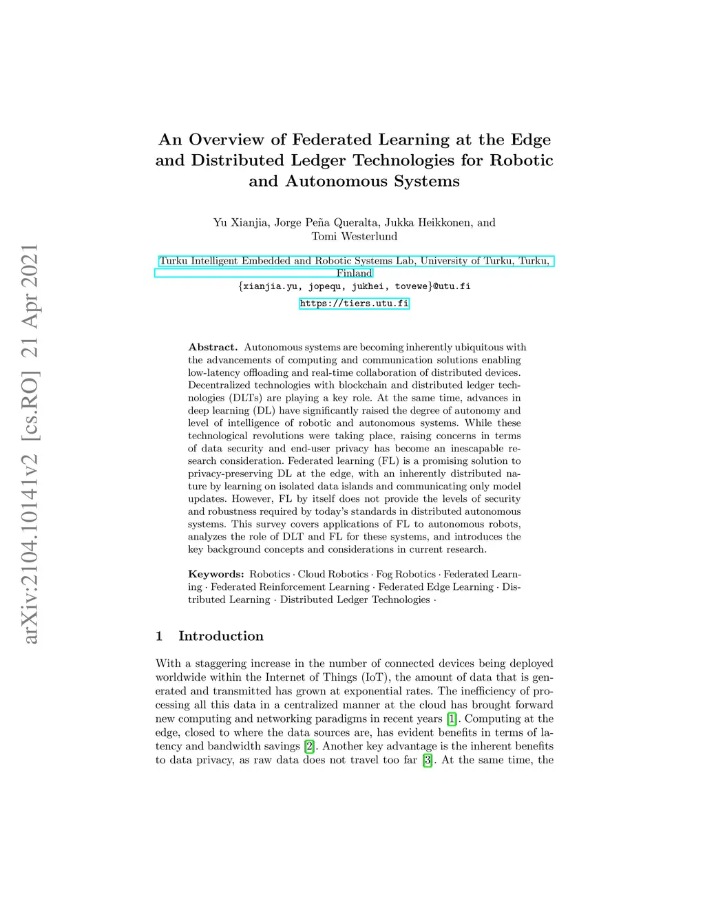 Autonomous systems are becoming inherently ubiquitous with the advancements of computing and communication solutions enabling low-latency offloading and real-time collaboration of distributed devices. Decentralized technologies with blockchain and distributed ledger technologies (DLTs) are playing a key role. At the same time, advances in deep learning (DL) have significantly raised the degree of autonomy and level of intelligence of robotic and autonomous systems. While these technological revolutions were taking place, raising concerns in terms of data security and end-user privacy has become an inescapable research consideration. Federated learning (FL) is a promising solution to privacy-preserving DL at the edge, with an inherently distributed nature by learning on isolated data islands and communicating only model updates. However, FL by itself does not provide the levels of security and robustness required by today's standards in distributed autonomous systems. This survey covers applications of FL to autonomous robots, analyzes the role of DLT and FL for these systems, and introduces the key background concepts and considerations in current research.