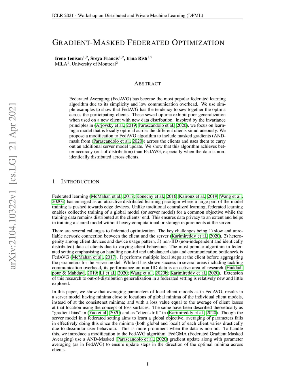 Federated Averaging (FedAVG) has become the most popular federated learning algorithm due to its simplicity and low communication overhead. We use simple examples to show that FedAVG has the tendency to sew together the optima across the participating clients. These sewed optima exhibit poor generalization when used on a new client with new data distribution. Inspired by the invariance principles in (Arjovsky et al., 2019; Parascandolo et al., 2020), we focus on learning a model that is locally optimal across the different clients simultaneously. We propose a modification to FedAVG algorithm to include masked gradients (AND-mask from (Parascandolo et al., 2020)) across the clients and uses them to carry out an additional server model update. We show that this algorithm achieves better accuracy (out-of-distribution) than FedAVG, especially when the data is non-identically distributed across clients.